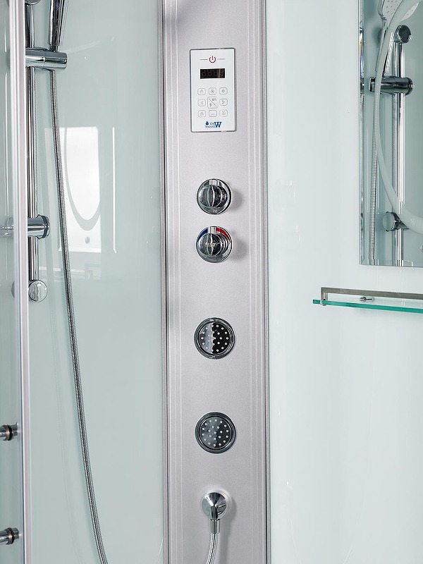 WeltWasser HALLE 1204 – качественная душевая кабина с богатым функционалом, привлекающая простотой в эксплуатации. Конструкция оснащена универсальной дверью, которая после установки раздвигается влево и вправо. Передние и боковые стенки кабины выполнены из надёжного и прочного закаленного стекла толщиной 5 миллиметров. Ему не страшны перепады температур, случайные удары. Задняя стенка изготавливается из идентичного стекла, но окрашивается в белую цветовую гамму. В зависимости от собственных предпочтений, человек может пользоваться ручным душем, выбирая наиболее оптимальное для себя положение, либо верхним. Верхний LED свет создает приятное освещение внутри кабины. Сенсорный пульт оснащен функцией bluetooth и вы можете наслаждаться любимой музыкой с телефона. Смеситель Термостат поможет выбрать и зафиксировать оптимальную температуру для принятия душа. Две регулируемые гидромассажные форсунки сделают приятный массаж. Монтаж кабины осуществляется без силикона. Внутри конструкции свободно помещается высокий человек, ведь её внутренняя высота составляет два метра.
