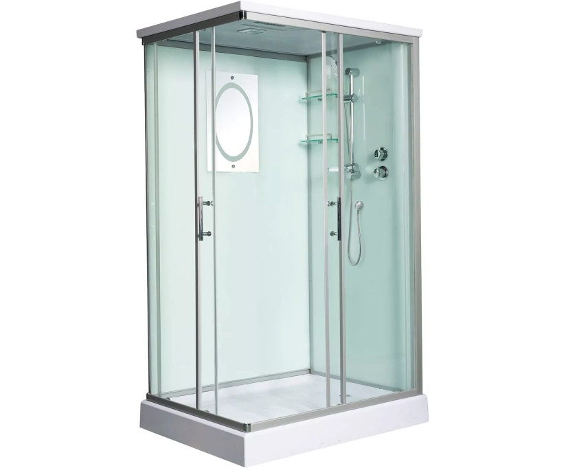 WeltWasser LAINE 1202 – качественная душевая кабина с богатым функционалом, привлекающая простотой в эксплуатации. Конструкция оснащена универсальной дверью, которая после установки раздвигается влево и вправо. Передние и боковые стенки кабины выполнены из надёжного и прочного закаленного стекла толщиной 5 миллиметров. Ему не страшны перепады температур, случайные удары. Задняя стенка изготавливается из идентичного стекла, но окрашивается в белую цветовую гамму. В зависимости от собственных предпочтений, человек может пользоваться ручным душем, выбирая наиболее оптимальное для себя положение, либо верхним. Специальная конструкция штанги позволяет ставить лейку в положение верхнего душа. Монтаж кабины осуществляется без силикона. Внутри конструкции свободно помещается высокий человек, ведь её внутренняя высота составляет два метра.