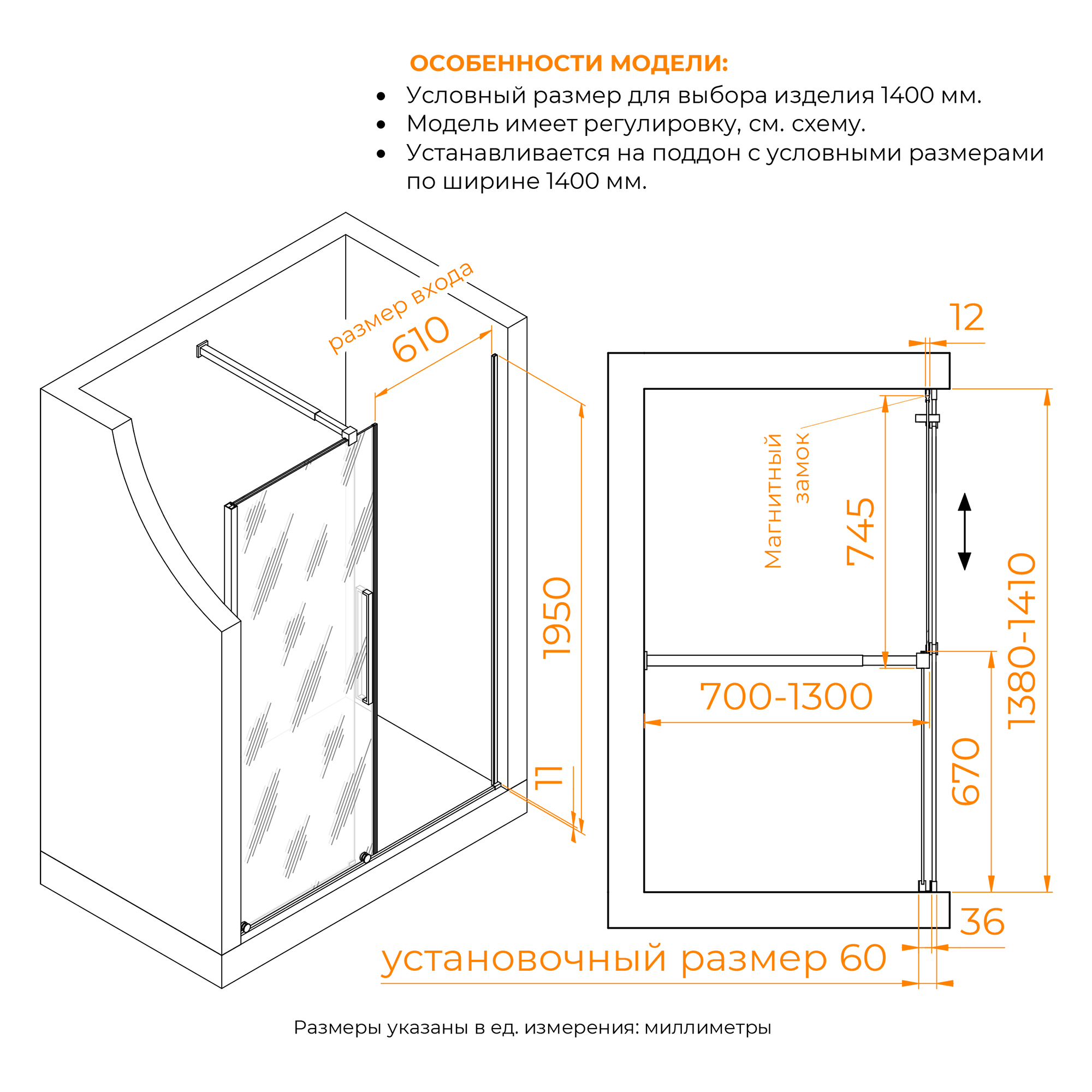 Изделие подходит для монтажа на душевой поддон, на подиум и ровный пол плитка с душевым трапом. Обратите внимания для монтажа на выступающий борт, его ширина должна составлять не менее 6 см. Если Вы выше ростом чем дверь, примените в установке глубокий поддон или увеличьте высоту подиума.