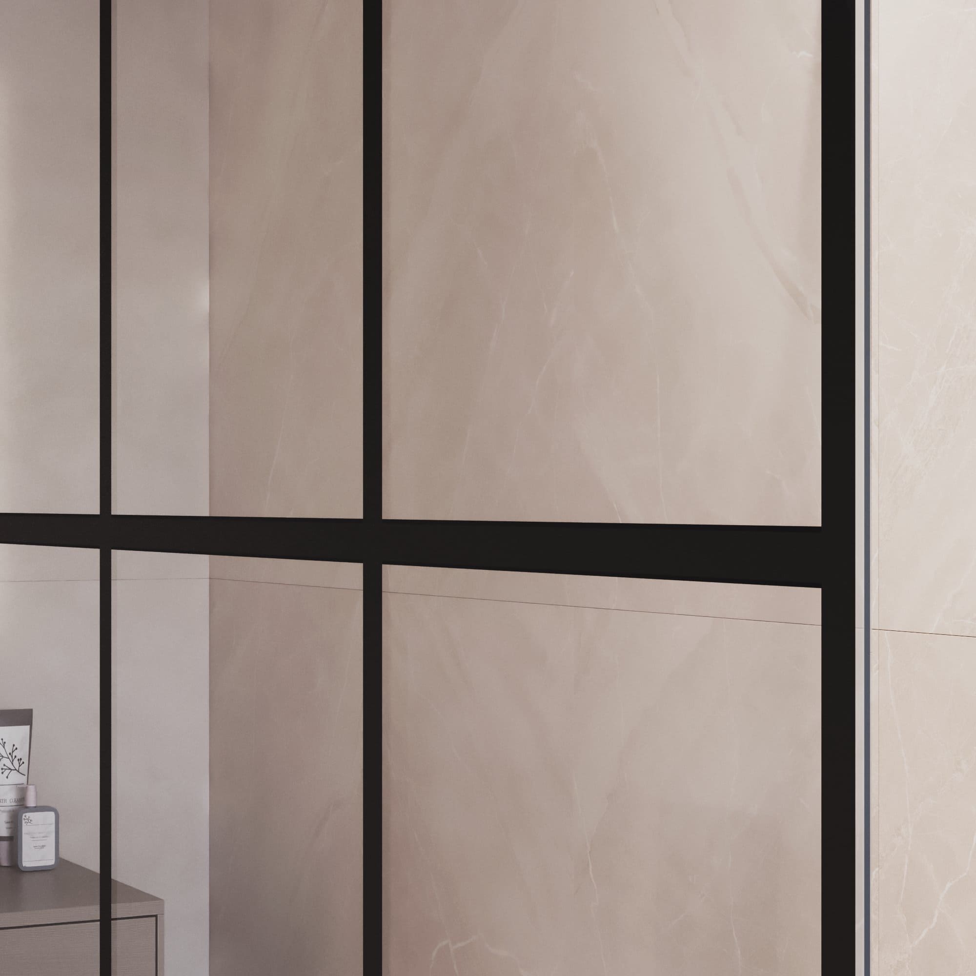 По периметру стекольного полотна и внутри его нанесён рисунок - тонкие черные линии. Вертикальные и горизонтальные полосы образовывают стильный геометрический рисунок - квадрат, который позволит поддержать строгий стиль интерьера.