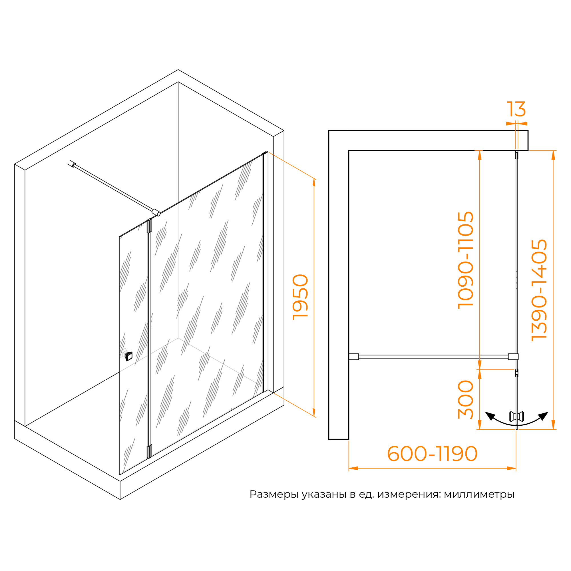 Душевая перегородка состоит из стационарного полотна и полотна с поворотной маятниковой частью - 300 мм. Стационарное стекольное полотно крепится к стене алюминиевым профилем с декоративной заглушкой. Подвижное полотно закреплено стальной маятниковой петлей с ходом 180 градусов.