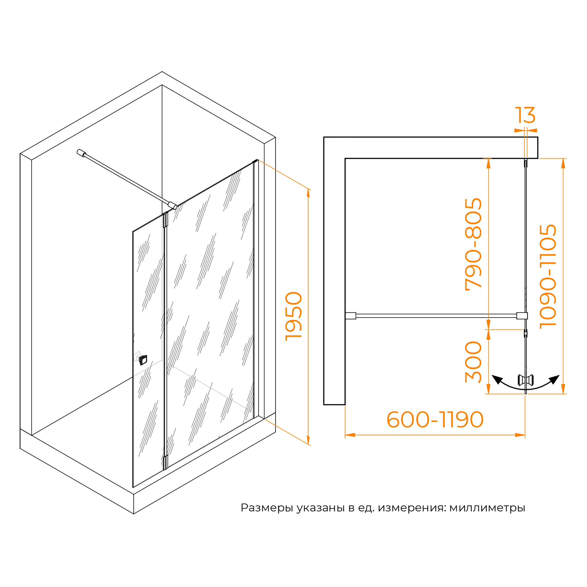 Душевая перегородка состоит из стационарного полотна и полотна с поворотной маятниковой частью - 300 мм. Стационарное стекольное полотно крепится к стене алюминиевым профилем с декоративной заглушкой. Подвижное полотно закреплено стальной маятниковой петлей с ходом 180 градусов.