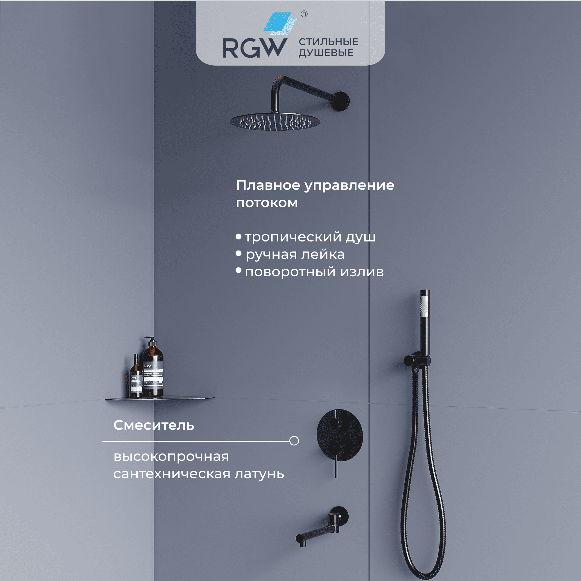 Душевые системы RGW с верхним душем гармонично вписываются в интерьер любой ванной комнаты за счет современного дизайна и продуманной эргономики.
