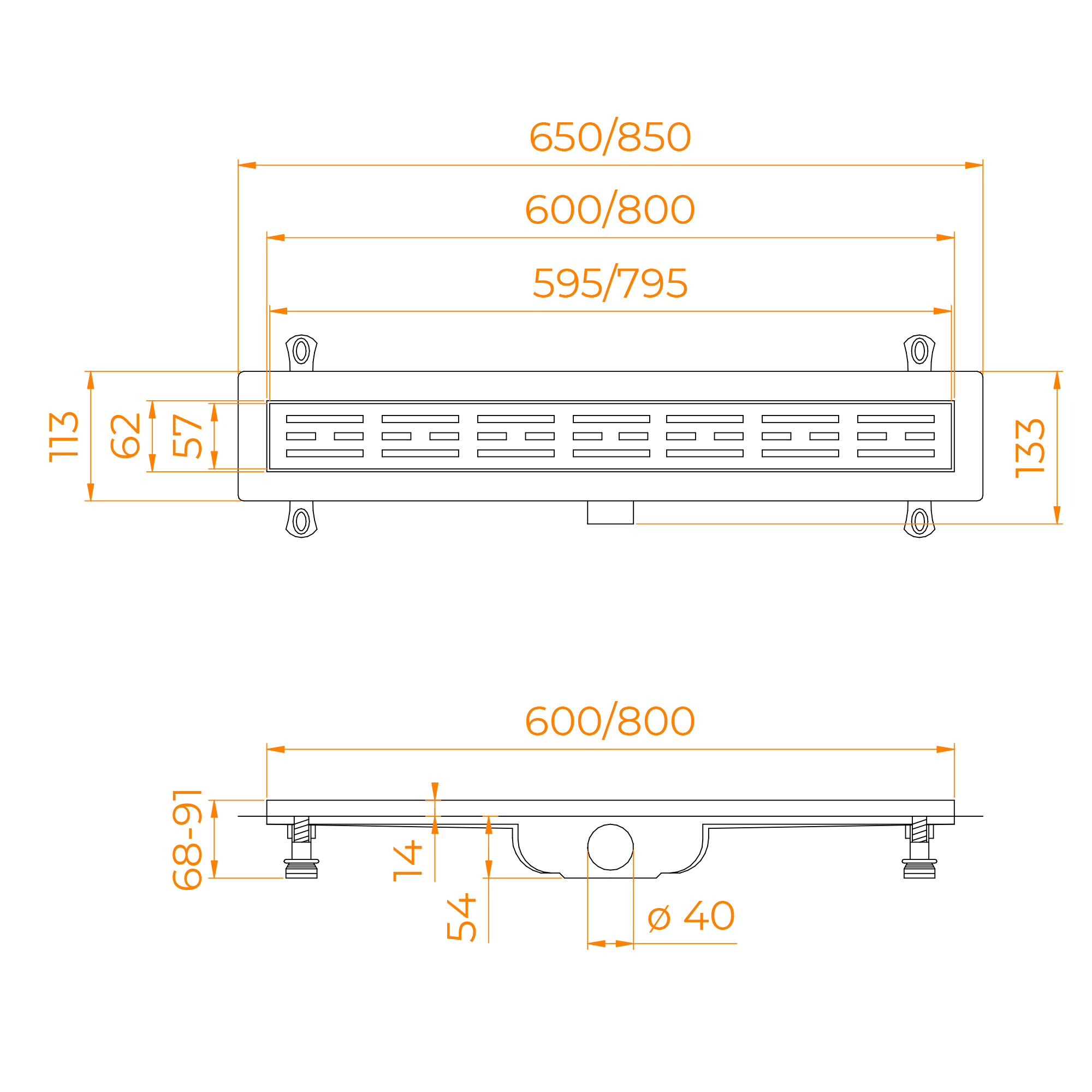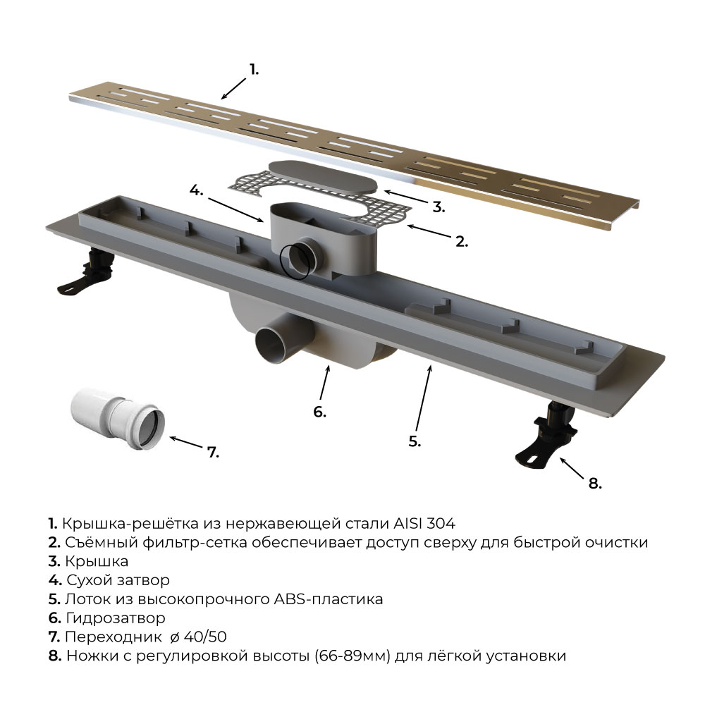 Водоотводящий желоб трапа имеет технический уклон, что обеспечивает оптимальную производительность. Кроме того, конструкция включает в себя снимаемый фильтр-сетку, которая эффективно улавливает крупный мусор и волосы, упрощая процесс обслуживания и чистки. В комплект также входят регулируемые ножки с диапазоном высоты от 68 до 91 мм и гидроизоляционная лента, обеспечивающая надежную герметизацию.