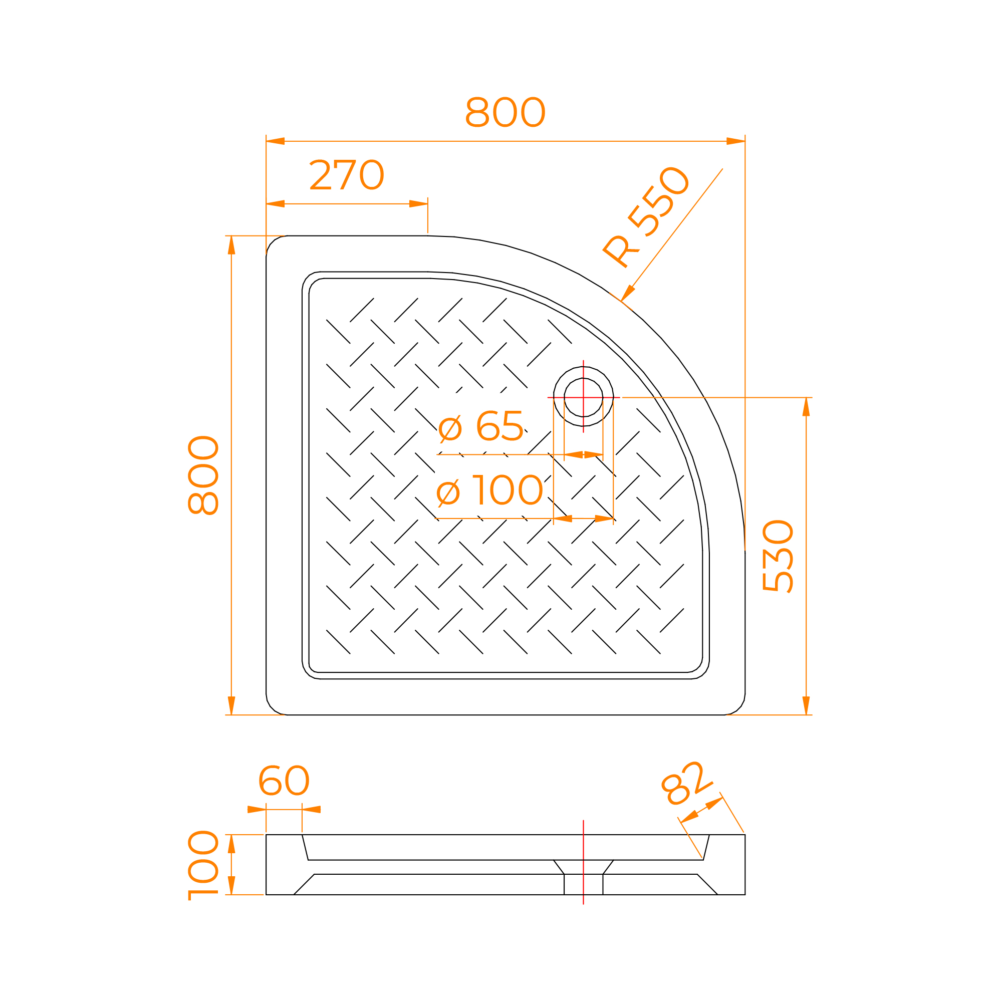 Поддон для душа белого цвета, полукруглый (четверть круга) из санфарфора с уклоном под слив. Представляет собой единую плиту с бортиками из высококачественной керамики с отверстием для сифона.
