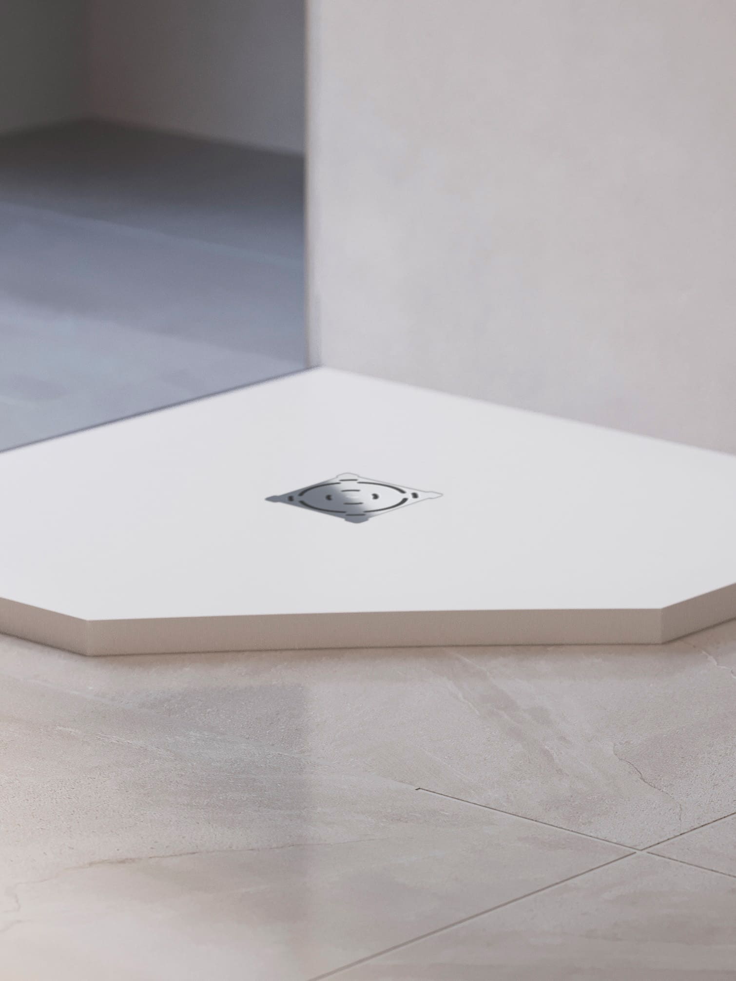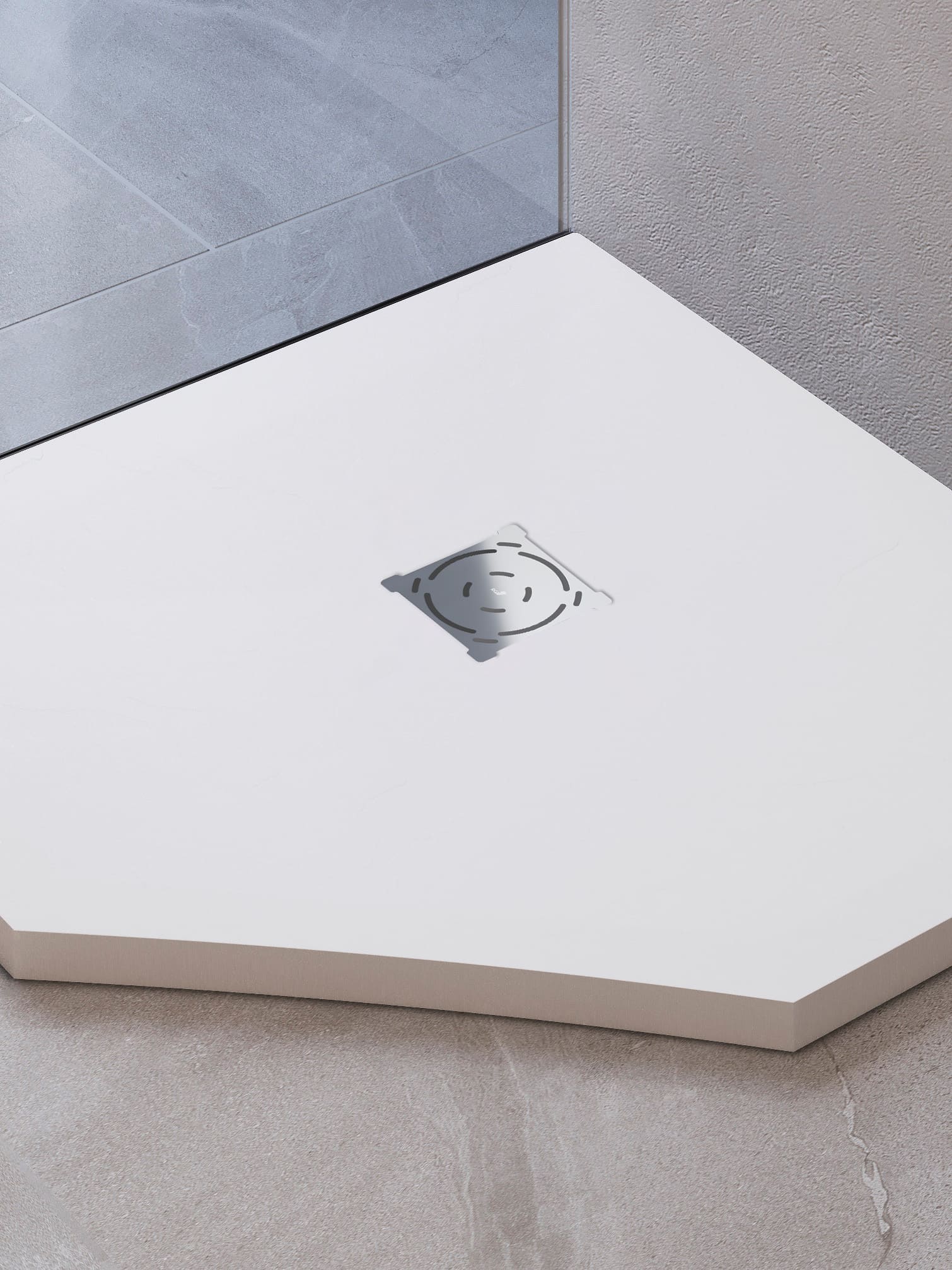 Новый поддон — это самостоятельный аксессуар вашей душевой. Универсальный цвет, откликающийся на уровень освещения, и текстура “под камень” идеально сочетаются с интерьерами от смелых лофт и хайтек до романтичного прованса, а решетка из нержавеющей стали, защищающая слив, создаст безупречный аккомпанемент душевым системам, а таком же оттенке.