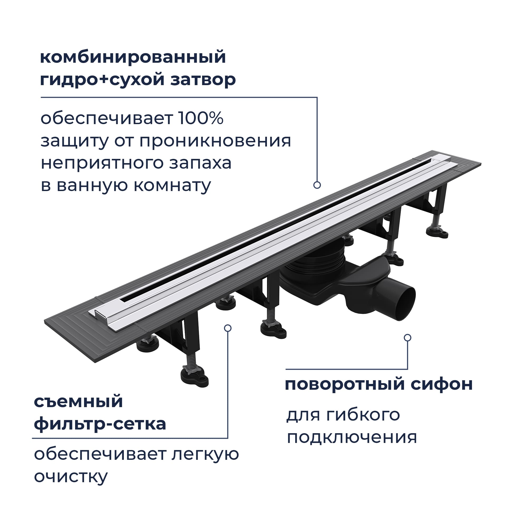 Комбинированный затвор: сухой + гидрозатвор — 100% защита от неприятных запахов, даже если длительное время не пользовались душевой, и вода в гидрозатворе испарилась. При данной конструкции слив обеспечивает высокую пропускную способность — 32 л/мин.