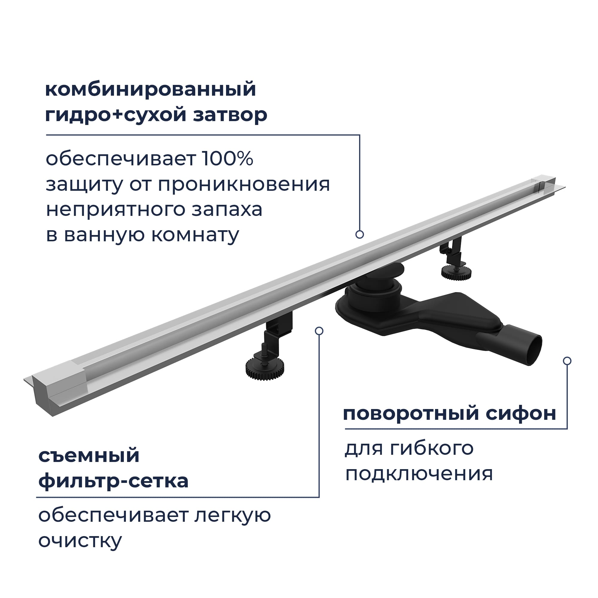 Трап комплектуется двумя усиленными опорами (ножками), крепления для опоры и сами опоры выполнены из нержавеющей стали и имеют регулировку высоты для простой и быстрой установки. За счёт данной конструкции трап можно установить в центре душевого пространства и не возгораться на повреждение конструкции, даже если вы наступаете на него.