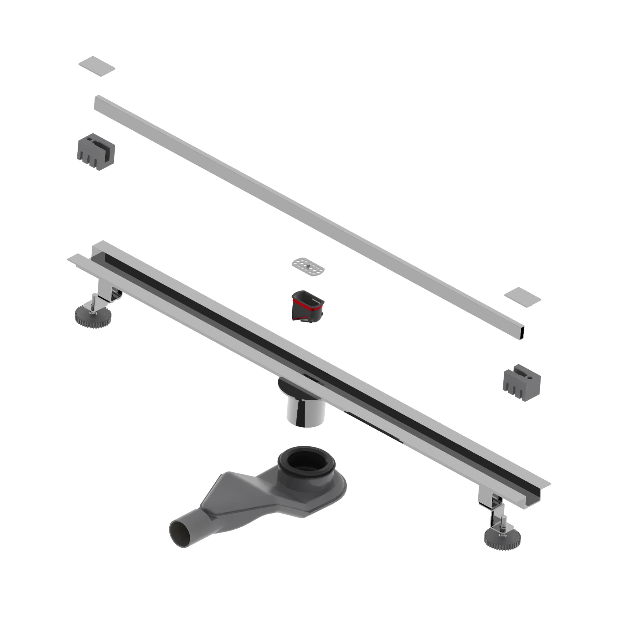 Трап комплектуется двумя усиленными опорами (ножками), крепления для опоры и сами опоры выполнены из нержавеющей стали и имеют регулировку высоты для простой и быстрой установки. За счёт данной конструкции трап можно установить в центре душевого пространства и не возгораться на повреждение конструкции, даже если вы наступаете на него.