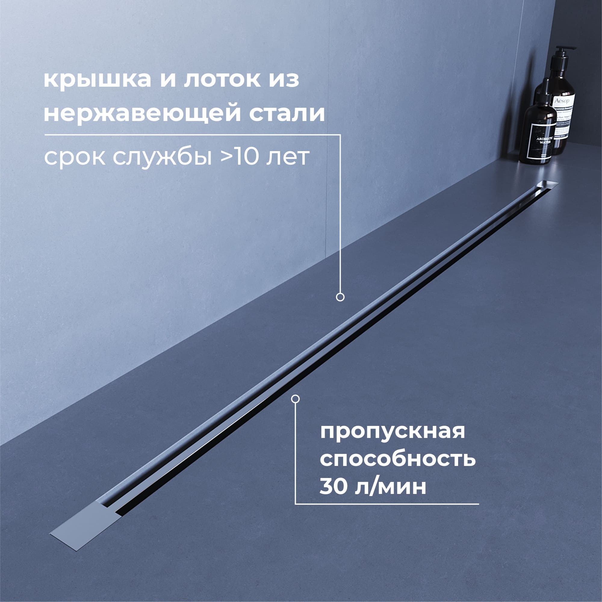 Возможность, через лоток организовать слив воды в любое душевое пространство, а именно подстраивается в конфигурации купели того размера, которые предусмотрены дизайн-проектом;