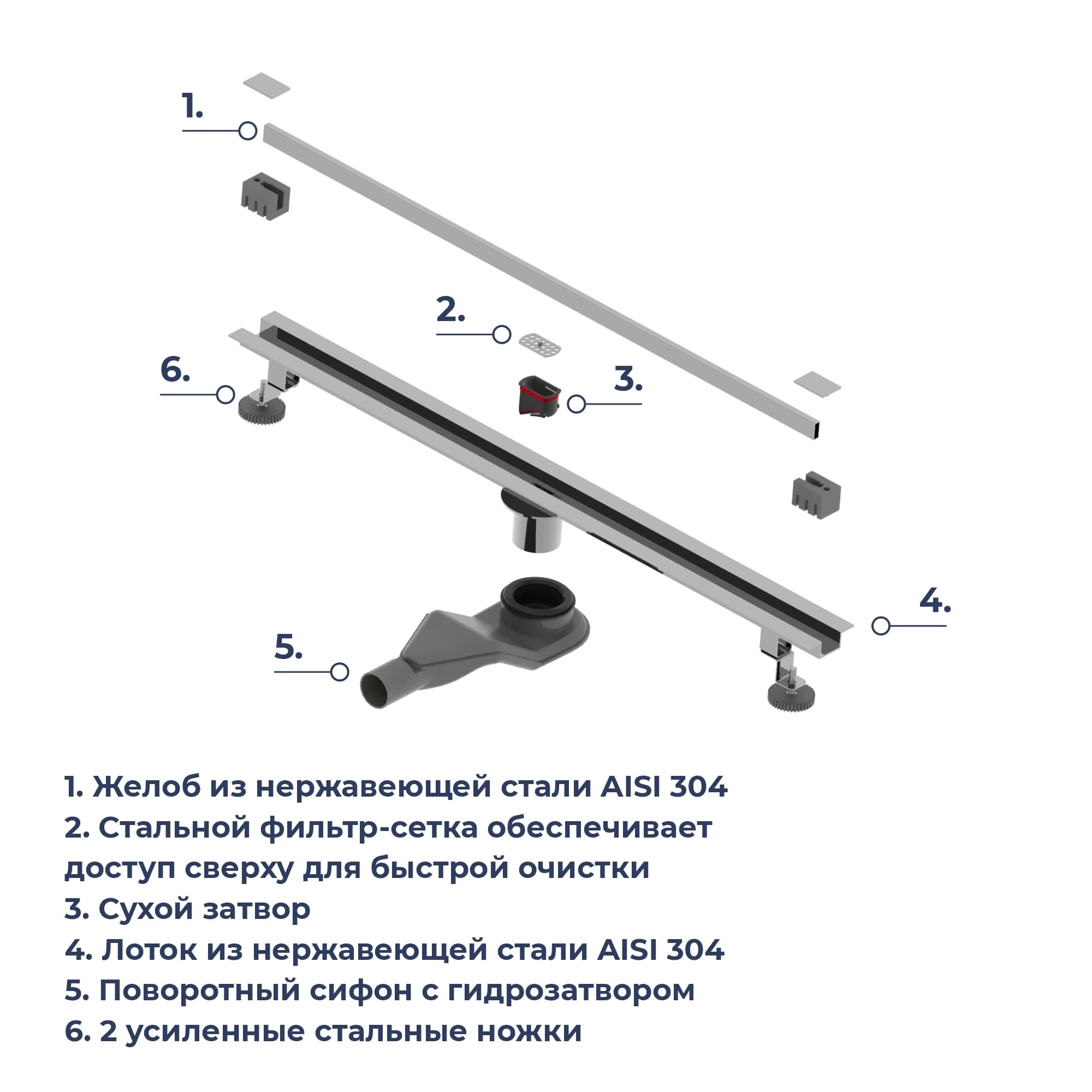 Трап комплектуется двумя усиленными опорами (ножками), крепления для опоры и сами опоры выполнены из нержавеющей стали и имеют регулировку высоты для простой и быстрой установки. За счёт данной конструкции трап можно установить в центре душевого пространства и не возгораться на повреждение конструкции, даже если вы наступаете на него.