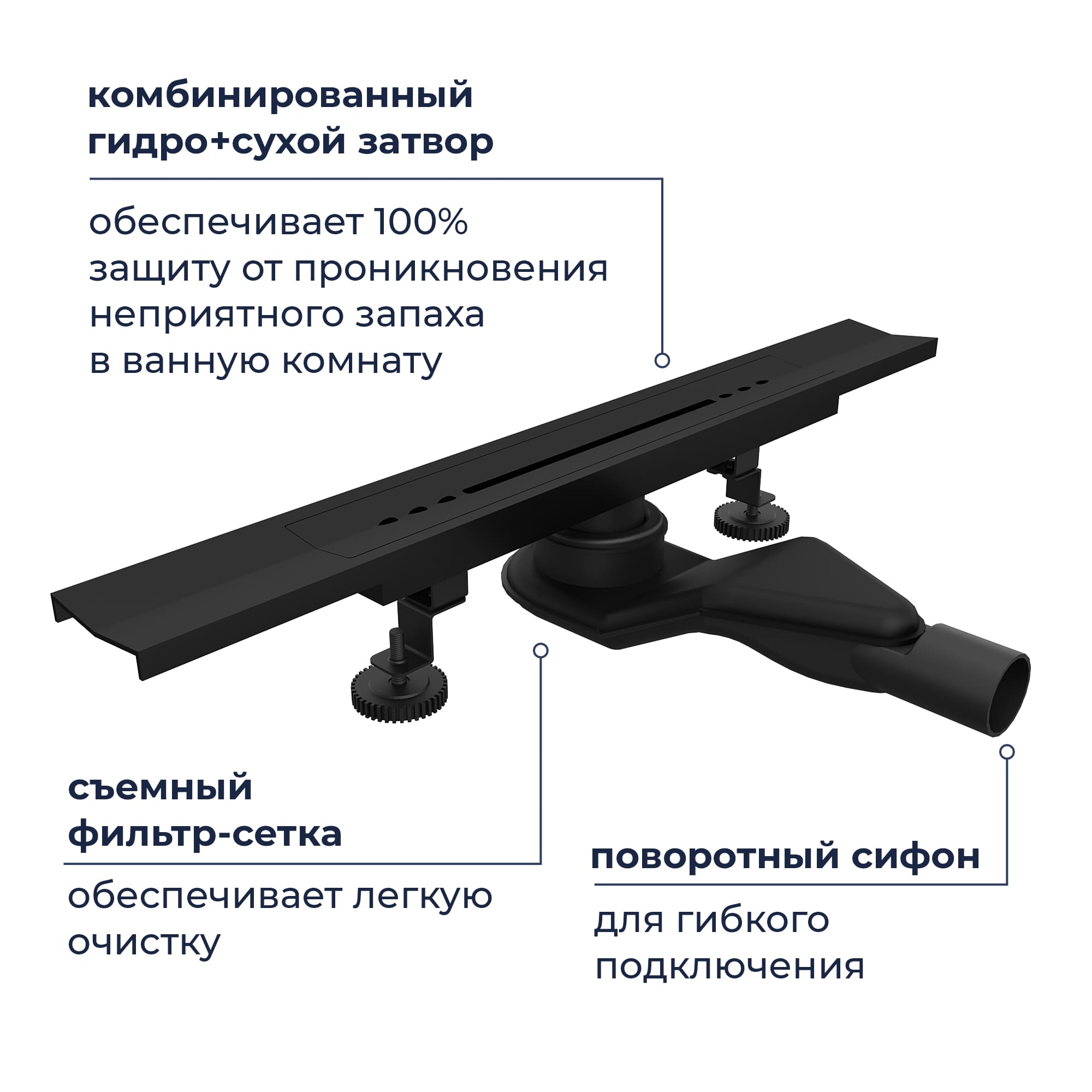 Ножки с возможностью независимой регулировки, позволяет установить уровень горизонта трапа и его монтажную высоту.