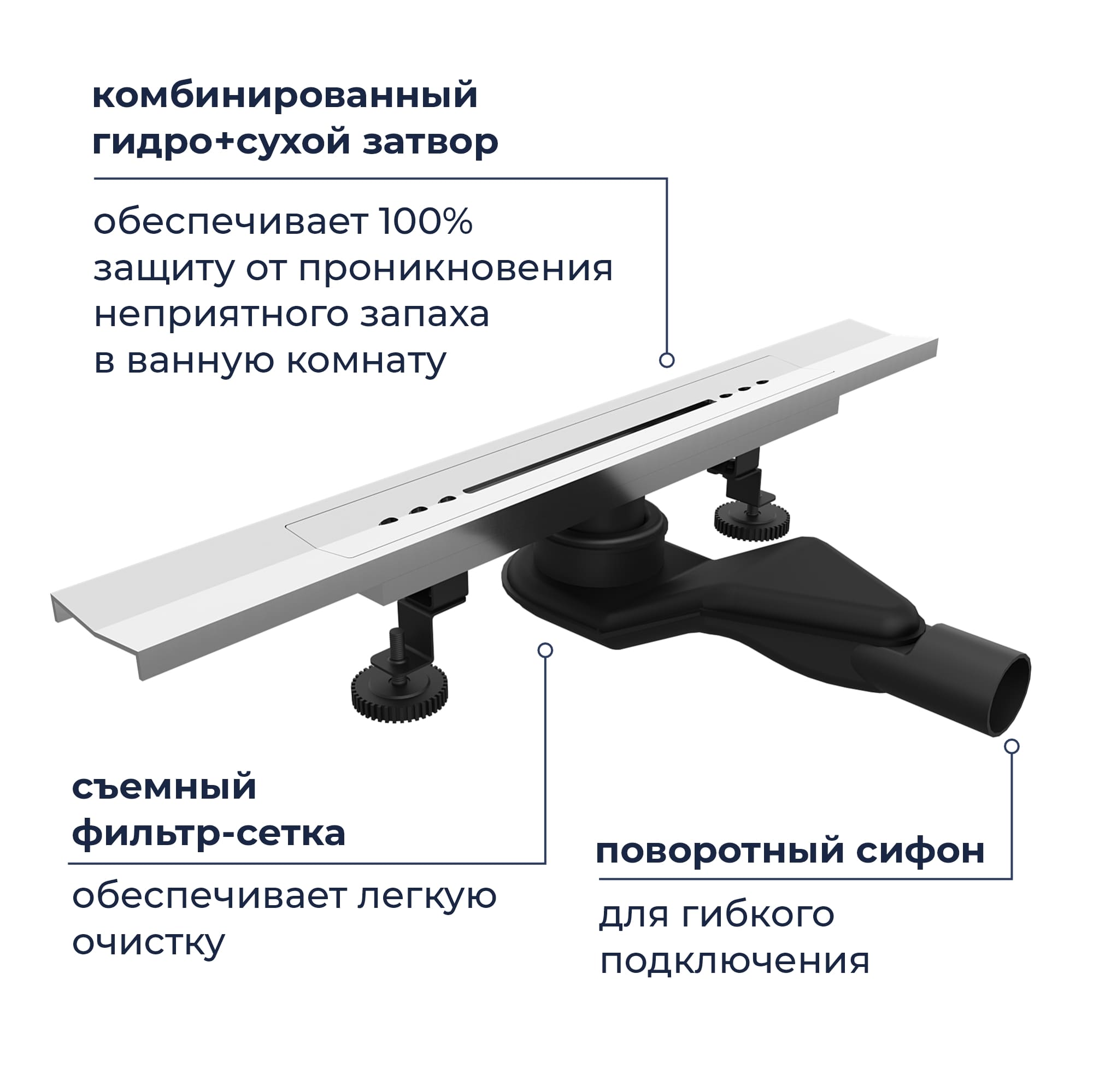 Комбинированный затвор: сухой + гидрозатвор — 100% защита от неприятных запахов, даже если длительное время не пользовались душевой, и вода в гидрозатворе испарилась. При данной конструкции слив обеспечивает высокую пропускную способность — 32 л/мин. Сифон боковой, вращающийся по направлению канализационного выхода, легко очистить вручную сверху, вплоть до сливной трубы. Имеет в комплекте пластиковый переходник 40/50 мм для сифона на канализационную трубу диаметром 50 мм.