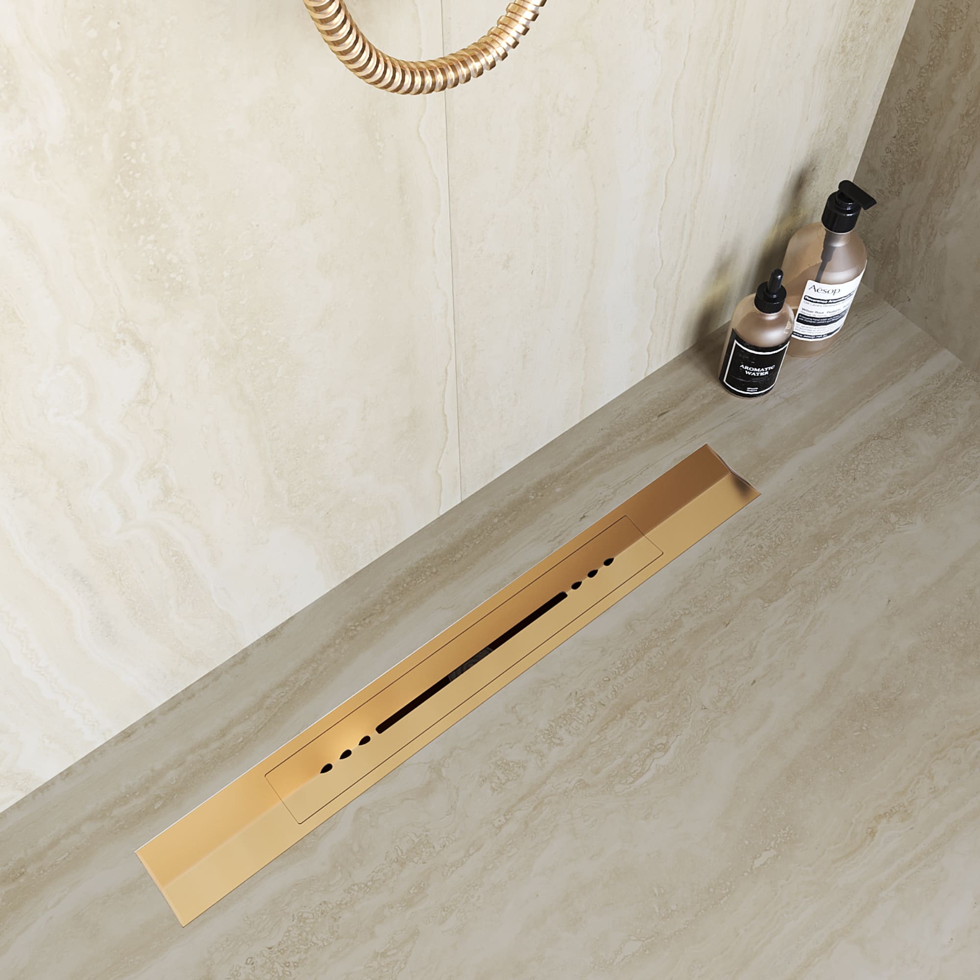 Душевой трап для душа, обрезной, золото Brush RGW SDR-53 горизонтальный с широкой крышкой, закрывающей универсальный душевой лоток