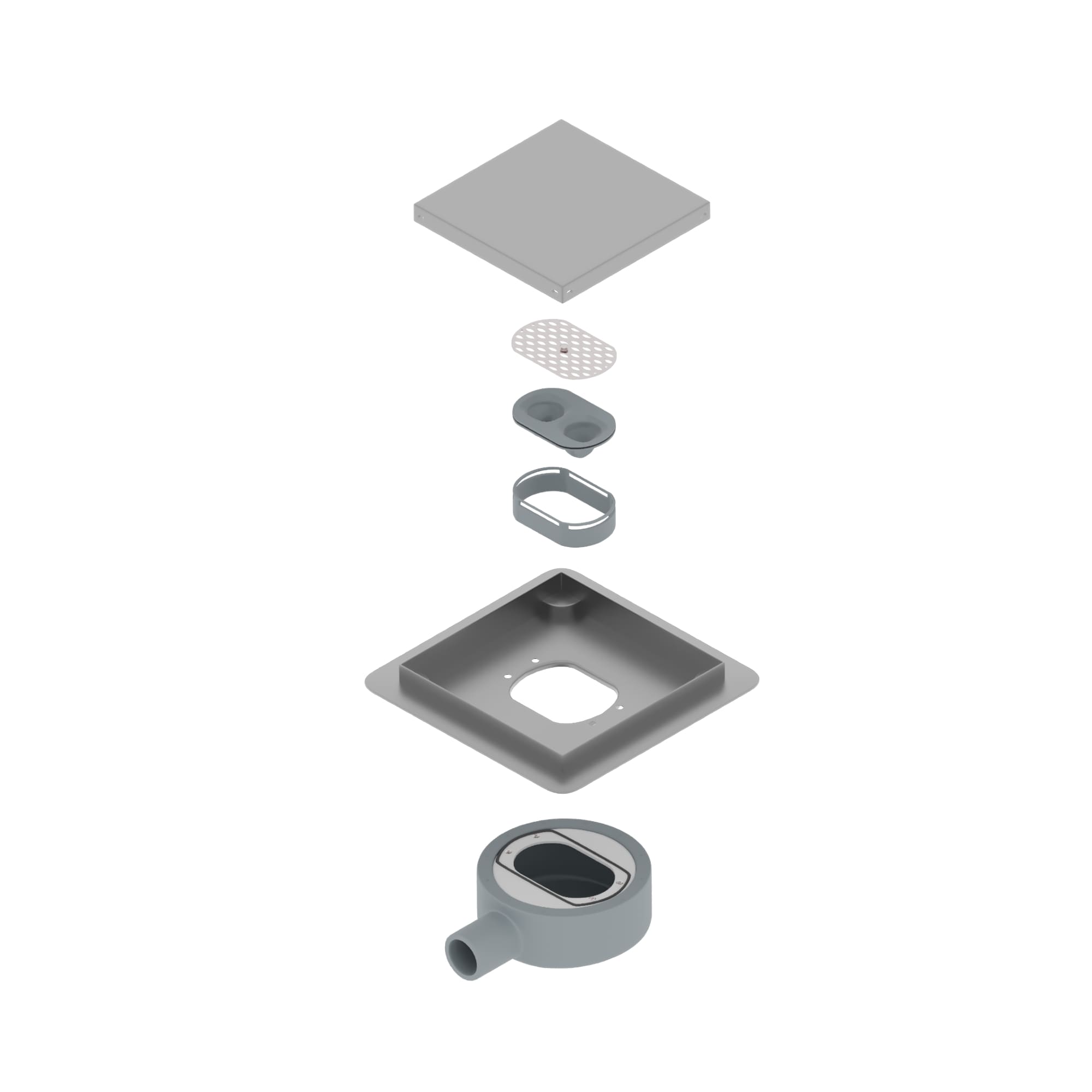 Декоративная крышка, встав на пластиковые упоры, образовывает щелевые отверстия с четырех сторон квадрата, куда сливается вся вода из душевого пространства. Для того чтобы вода эффективно отводилась в трап, на этапе монтажа необходимо обеспечить уклон облицовочной плитки в центр душевого трапа.