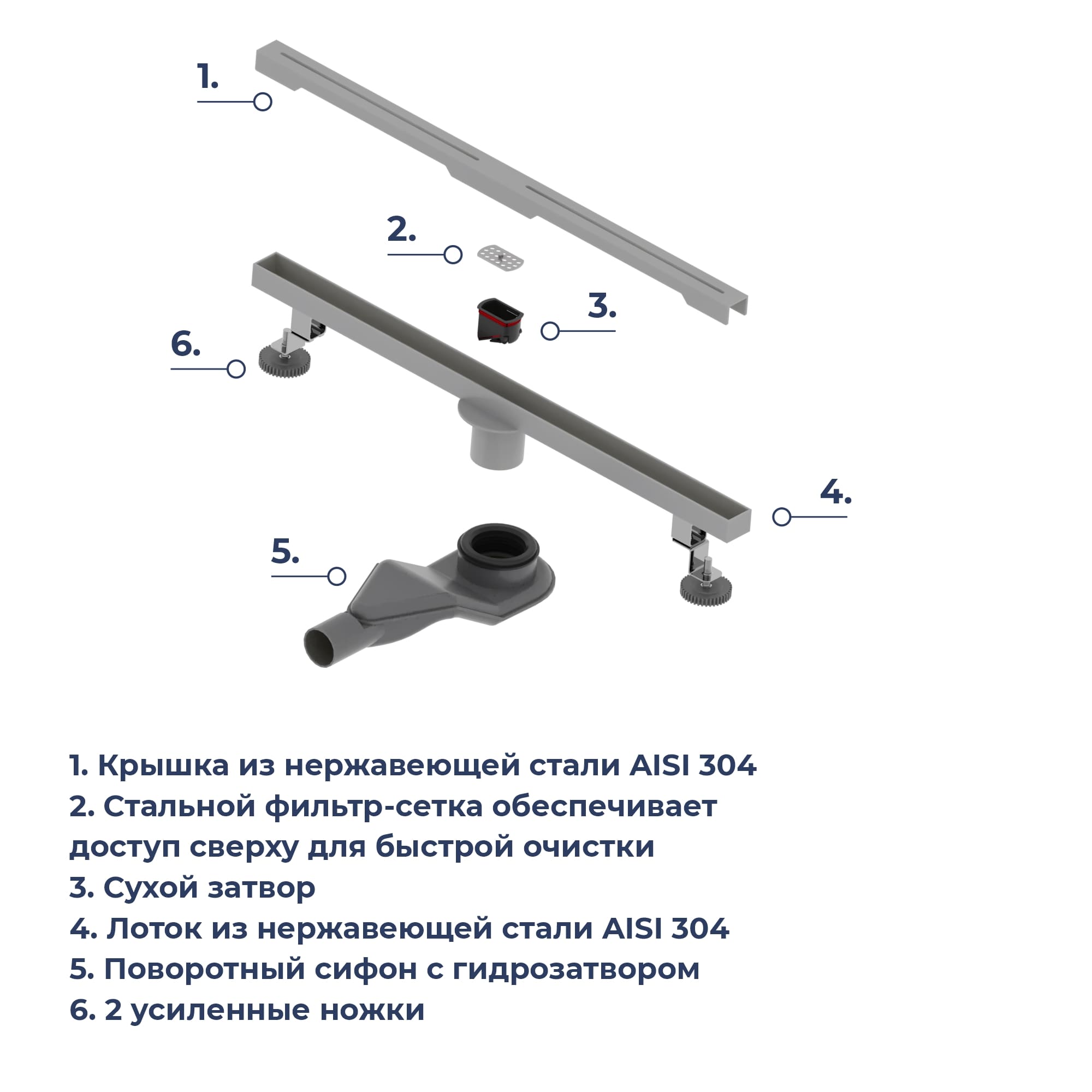 Изящная стильная крышка Style line с утончёнными линиями маскирует сливную систему, которая практически незаметна в дизайне интерьера, при этом сбор воды идет в широкий по своей форме лоток с техническим уклоном и далее через сухой затвор в поворотный для универсального подключения сифон;