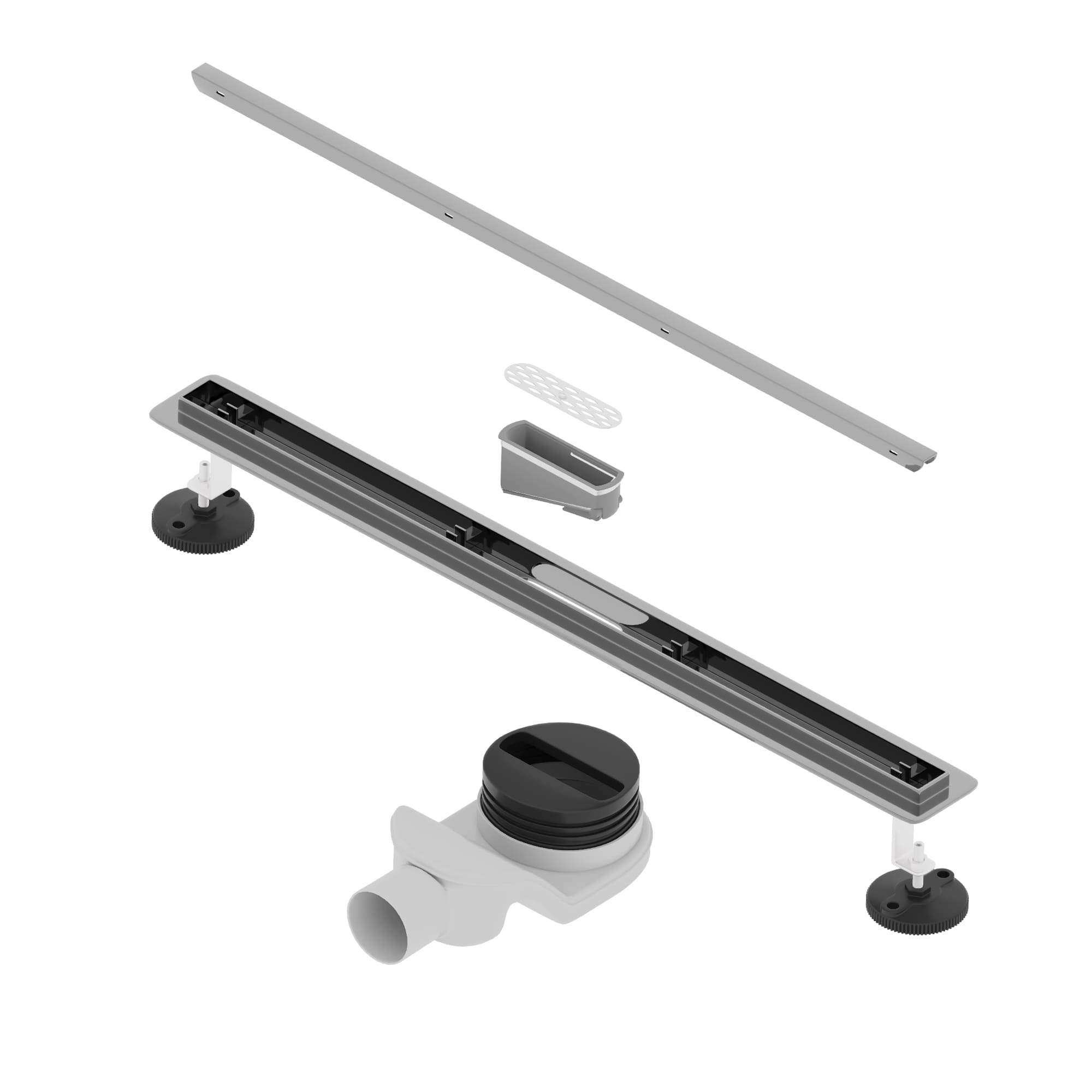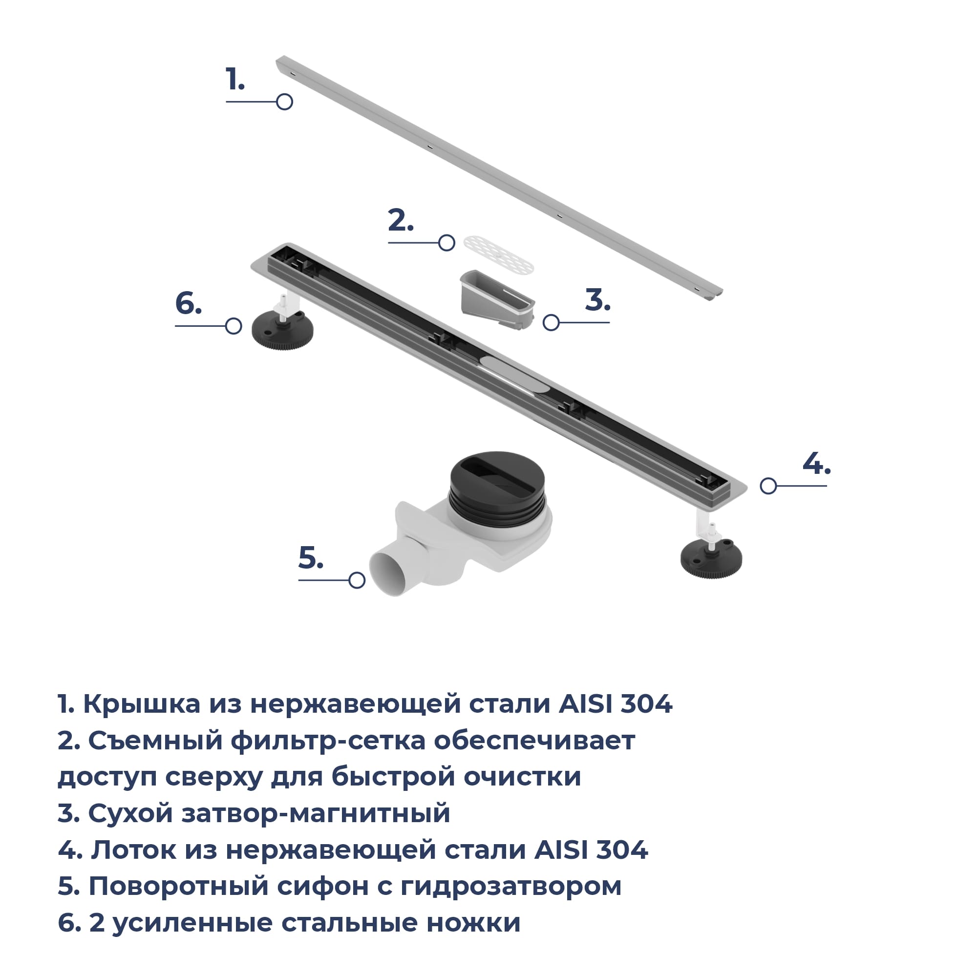 Узкая линия стальной крышки, удобно закрывающая сливную систему, практически незаметная в дизайне интерьера, при этом сбор воды идет в широкий по своей форме лоток и далее через сухой затвор в поворотный для универсального подключения сифон;