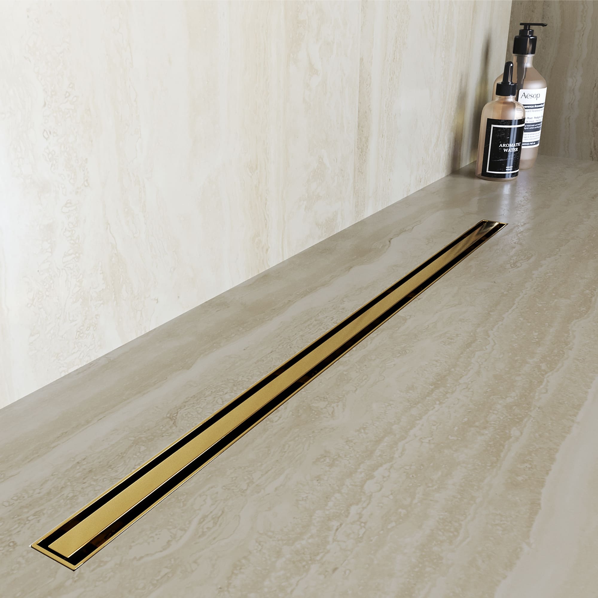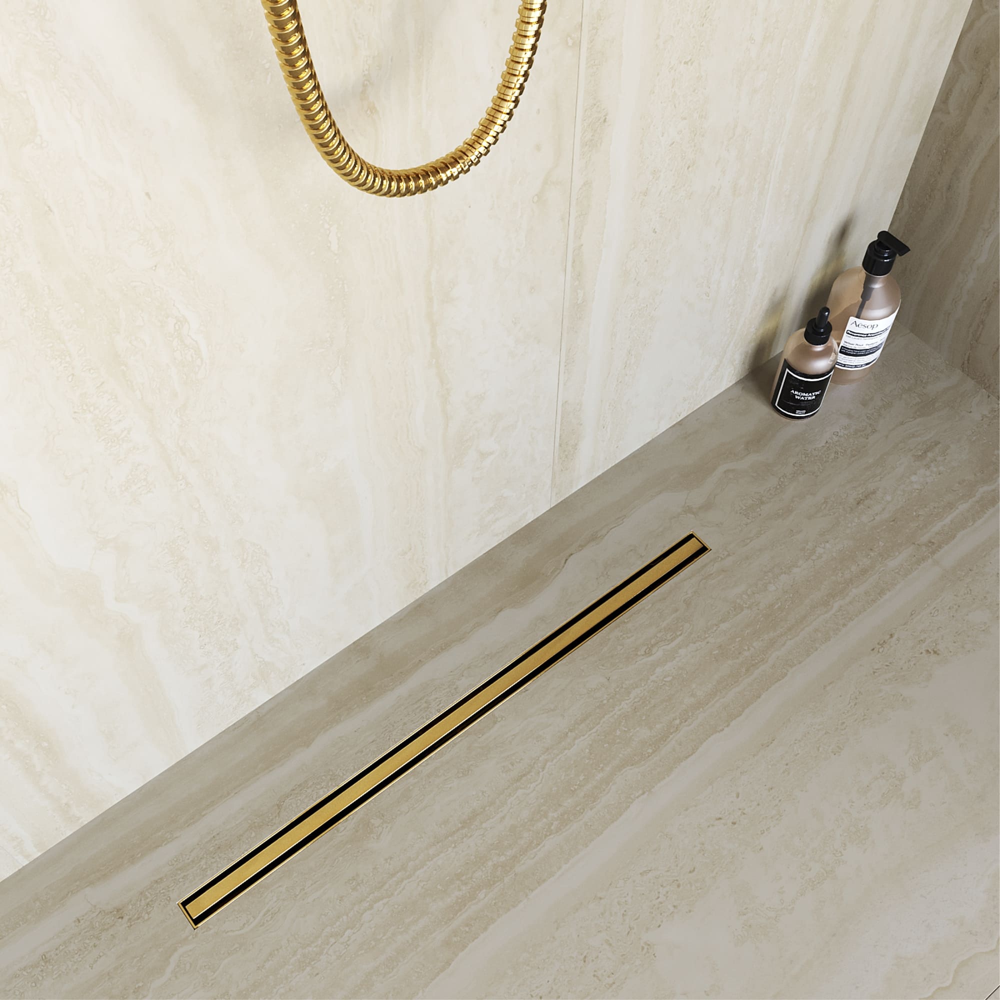 Принимающей декоративный жёлоб маскирует сливное устройство, образует щель, куда сливается вся вода из душевого пространства. Для того чтобы вода эффективно отводилась в трап, на этапе монтажа необходимо обеспечить уклон облицовочной плитки в сторону принимающего жёлоба.