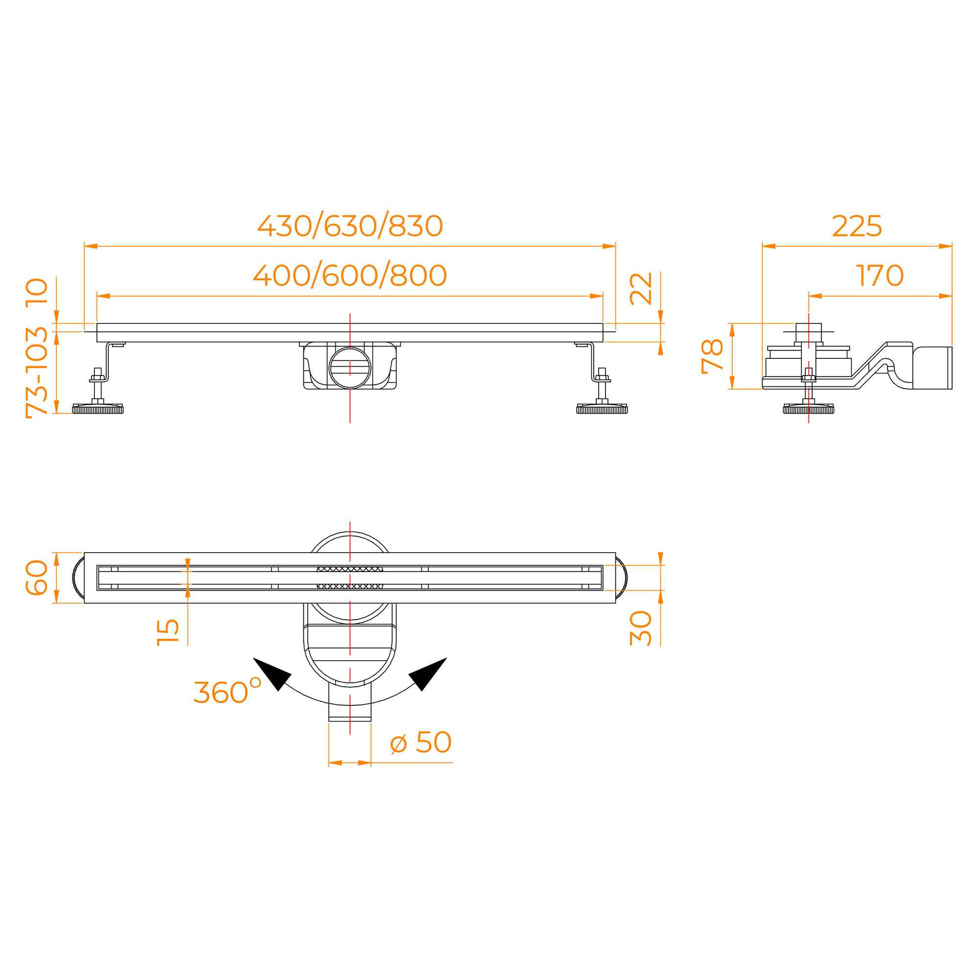 Две опоры из нержавеющей стали ISIA 304 с регулировкой высоты 73-103 мм;