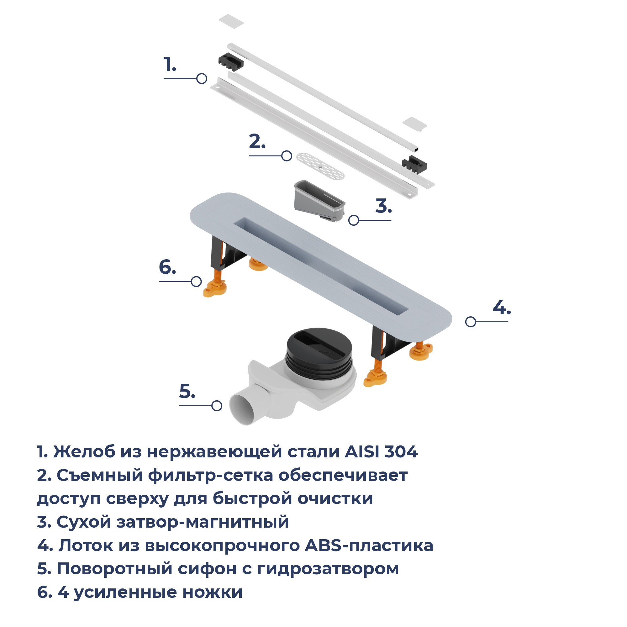 Лоток выполнен из толстостенного высокопрочного ABS-пластика, собирает стекающую воду и за счёт технического уклона отводит её в сетку-фильтр, которая задерживает волосы и мелкий мусор.