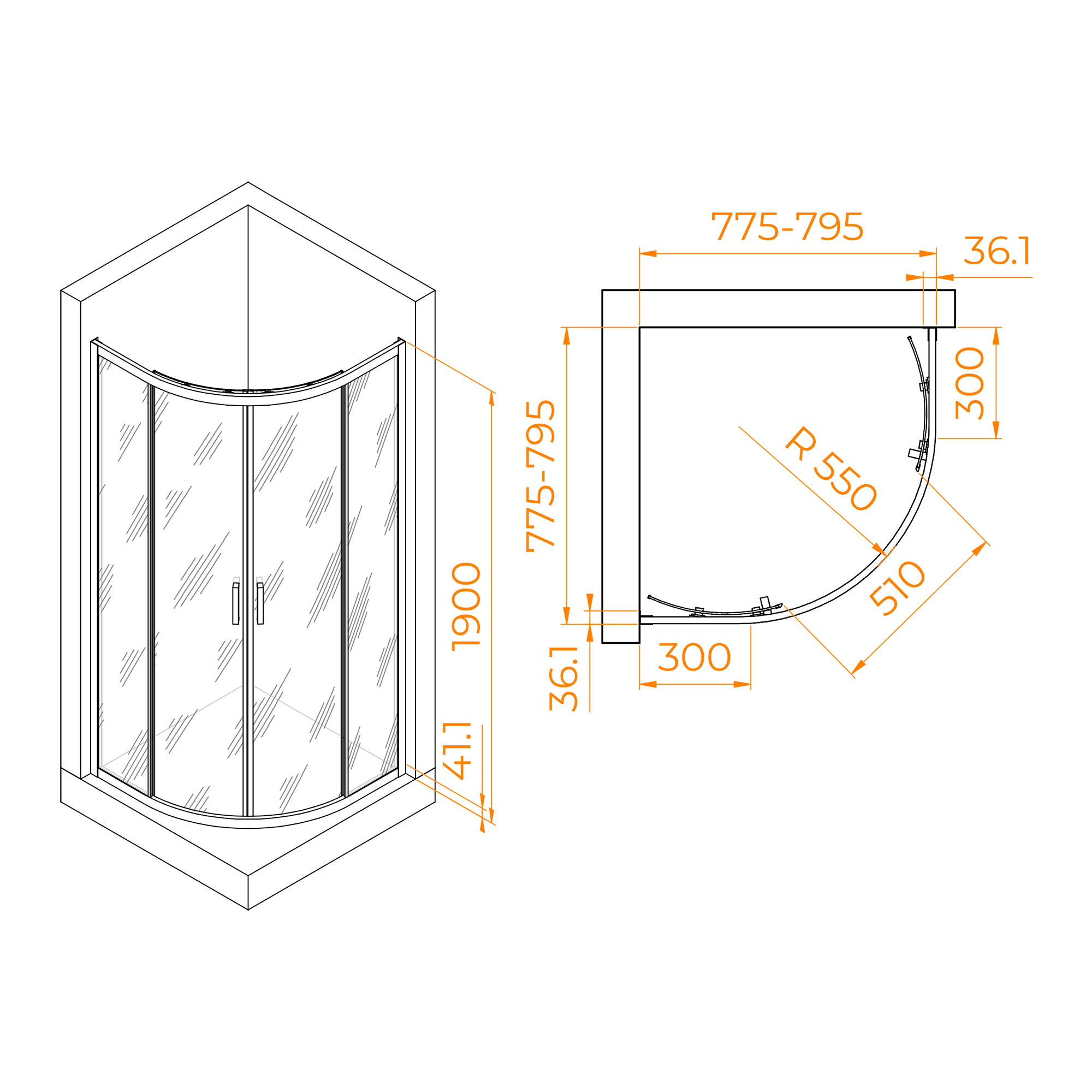Высота: 1950 мм – позволяет использовать душевой уголок даже для людей высокого роста.