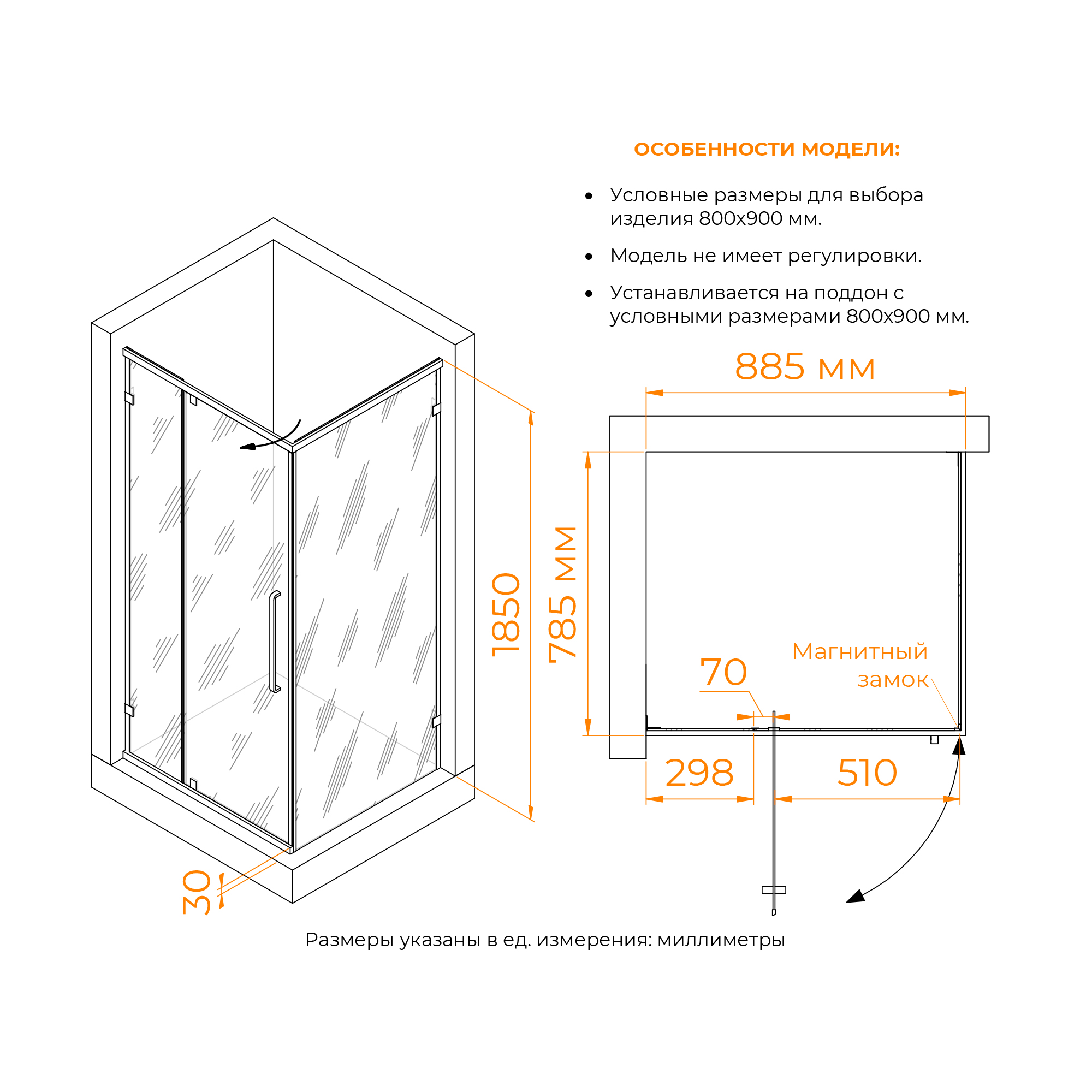 Модель представлена в чёрном исполнении профиля и фурнитуры, также обратите внимания, все уплотнители выполнены так же в чёрном цвете, что подчёркивает сдержанную стилистику душевых углов.