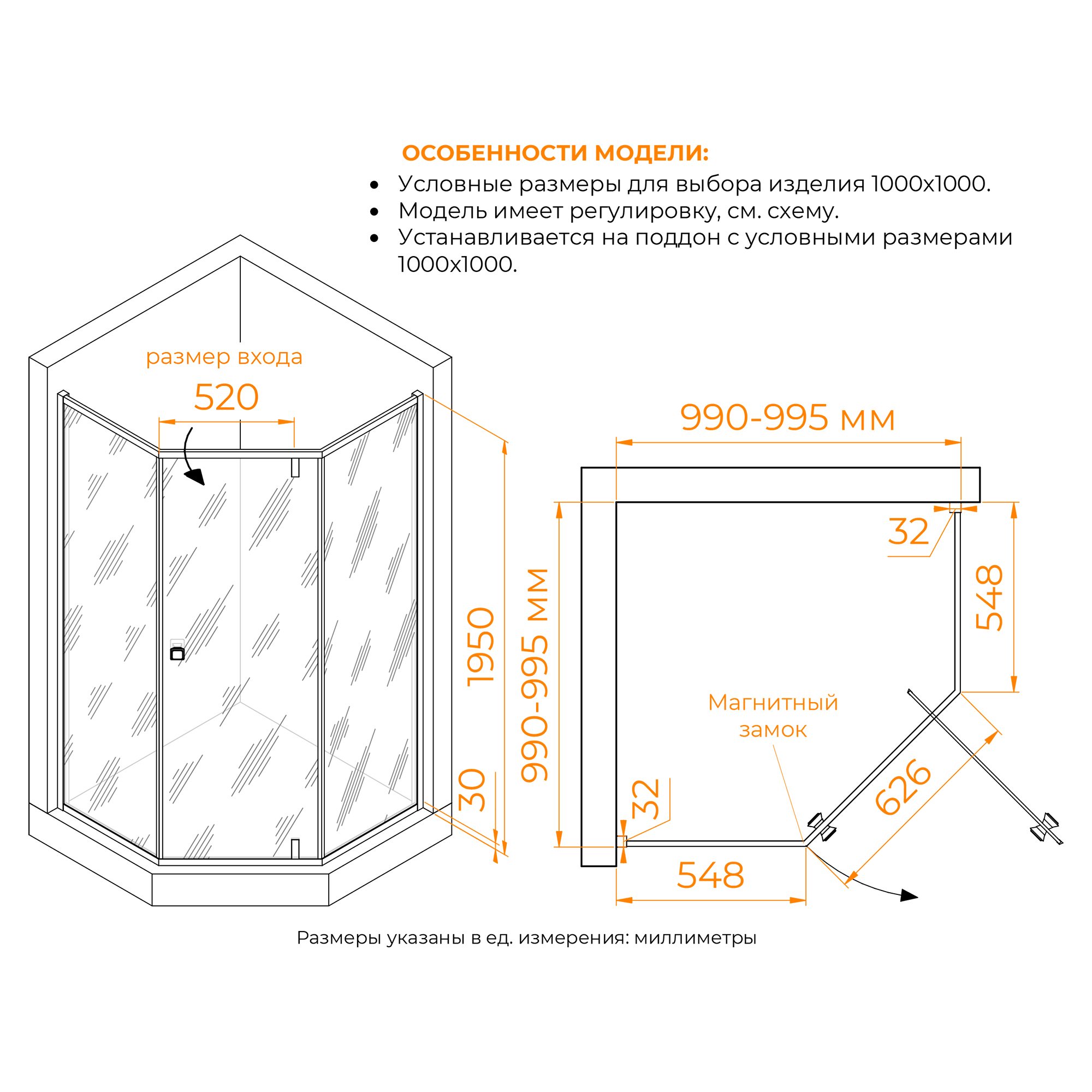 Длина х Ширина: 900х900 — (890-895)x(890-895) мм, 1000х1000 — (990-995)x(990-995) мм.