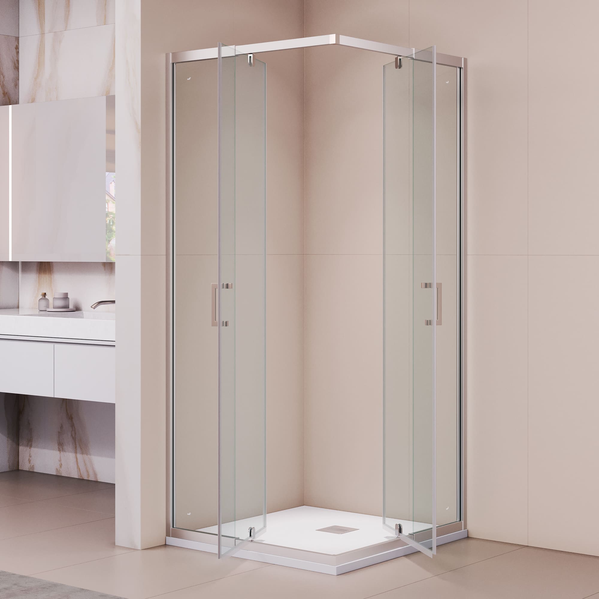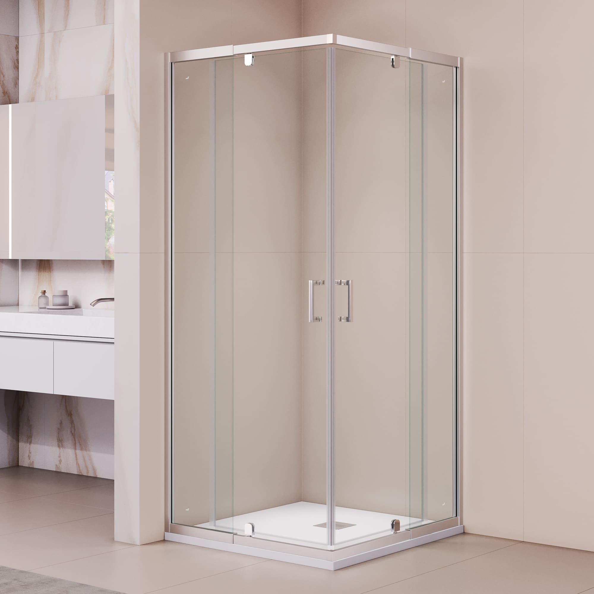 Конструкция дверей распашные, что обеспечивает максимально широкий доступ к душевому пространству и удобство использования. Для удобства пользователей, стекло дверей покрыто антикапельным покрытием Easy Clean, что позволяет легко удалять воду и избегать накопления известковых отложений.