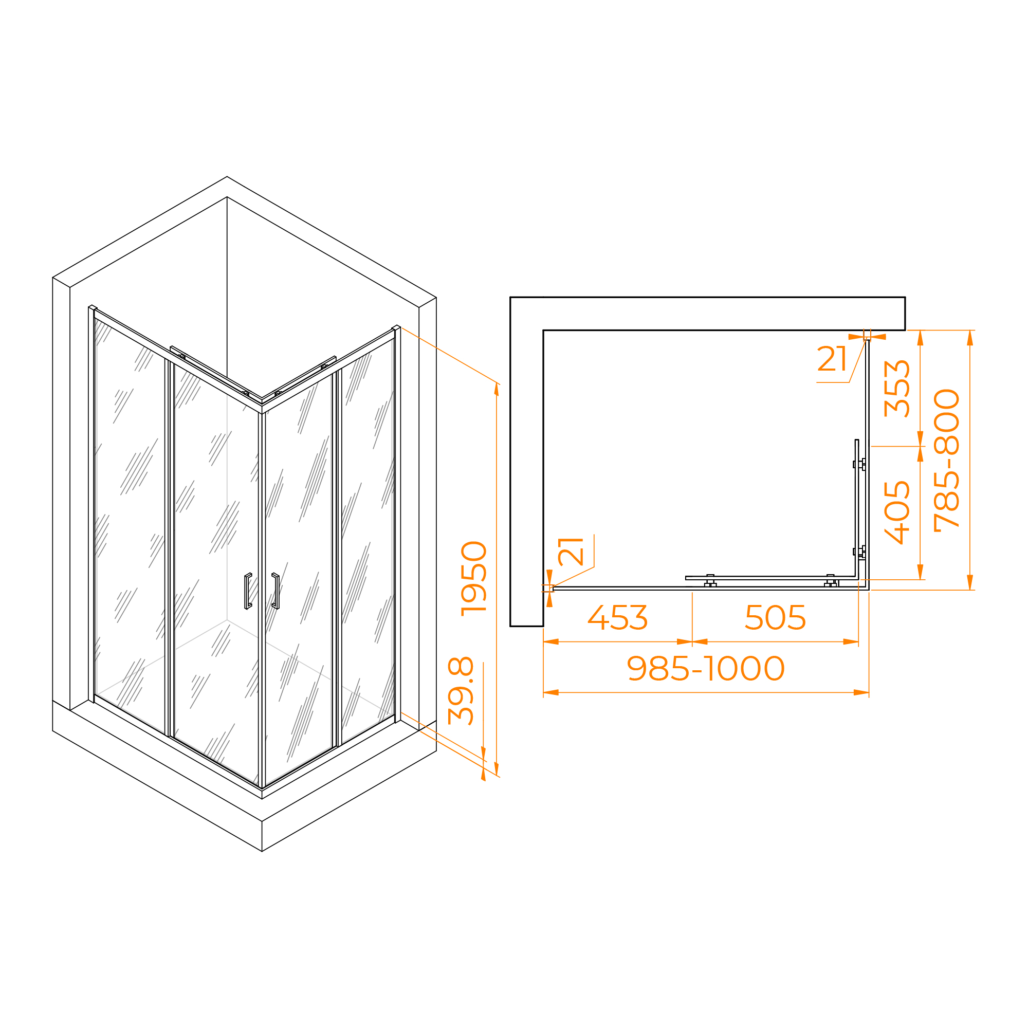 Профиль душевого уголка регулируемый, что позволяет настроить его под нужные размеры и требования клиента, обеспечивая точную и подходящую регулировку.