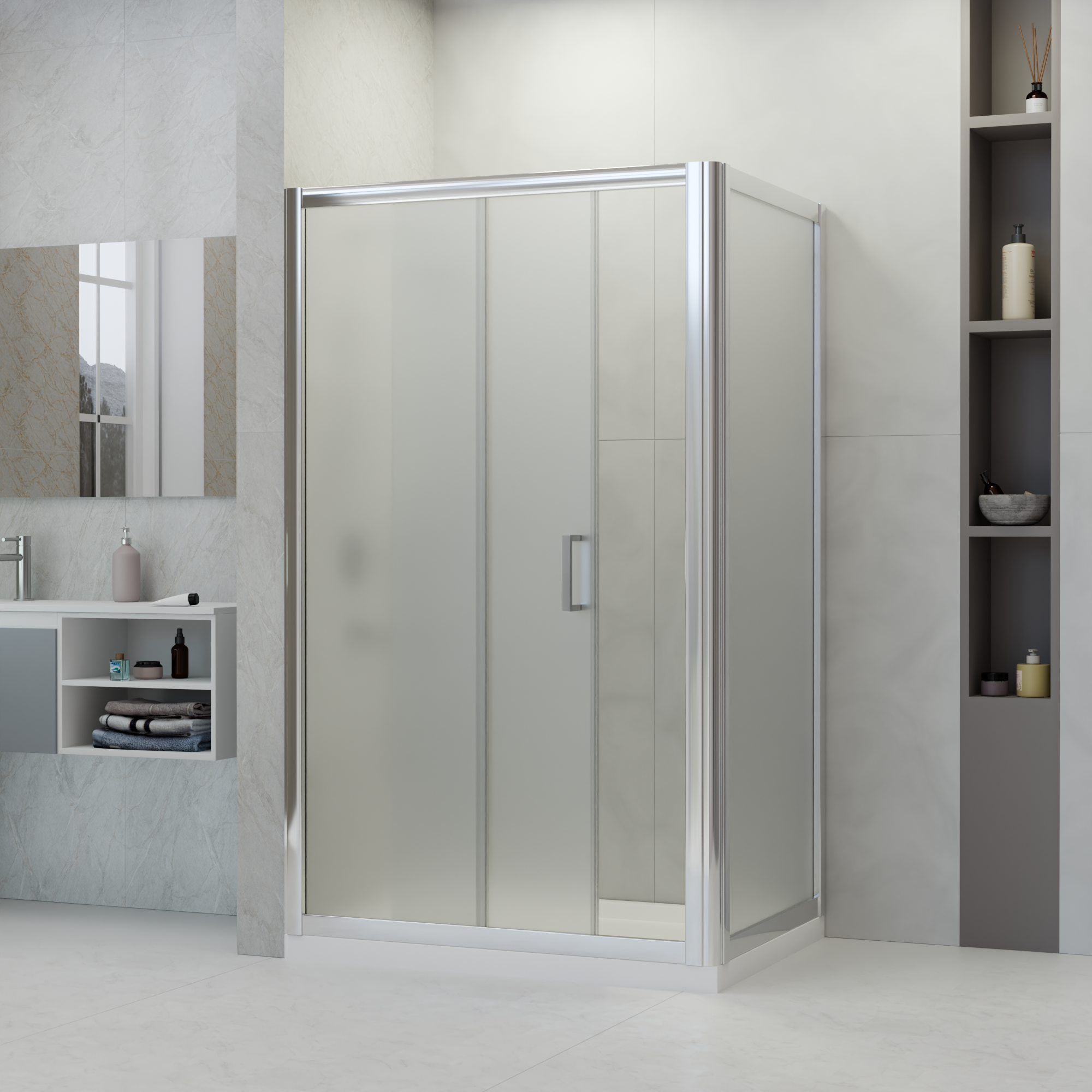 Стекло матовое (сатинированное). Матовость всех стекольных полотен создаёт 100% интимности в душевой зоне.