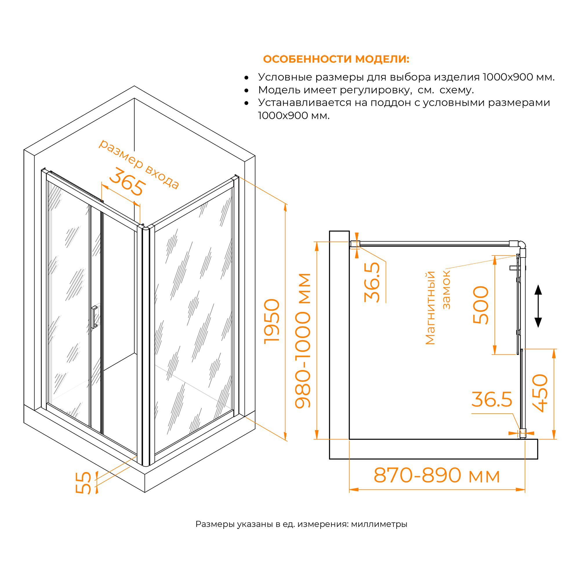 Душевое ограждение имеет универсальную установку открытия двери – с левой или правой стороны.