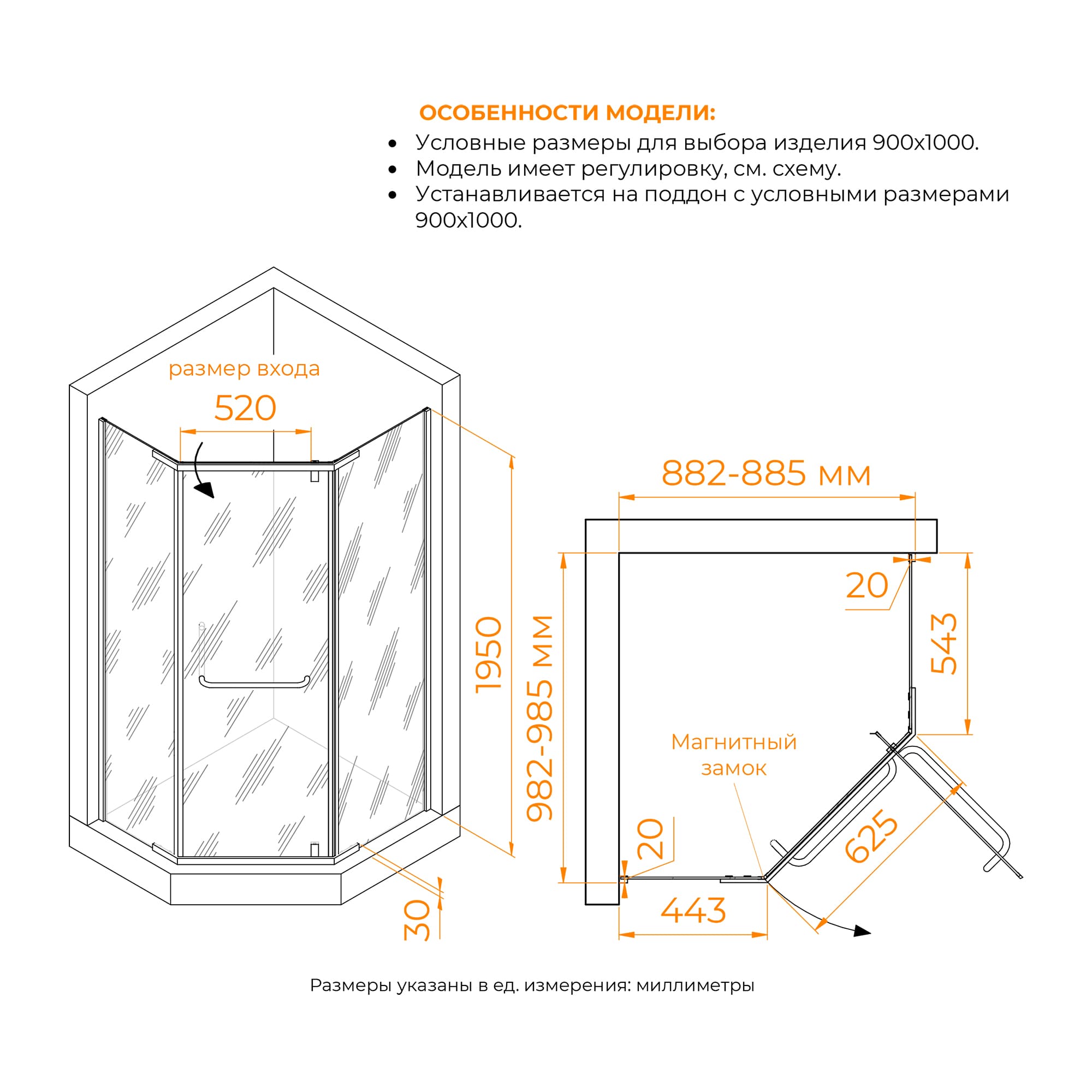 Душевой уголок RGW PA-091 – это изысканное решение для современной ванной комнаты. Сочетание прочного закаленного стекла толщиной 6 мм, элегантного хромированного профиля и асимметричной трапециевидной формы создает стильный и функциональный дизайн. Распашные двери с водонепроницаемыми петлями обеспечивают удобный доступ и герметичность. Специальное антикапельное покрытие Easy Clean упрощает уход за стеклом, а регулируемый профиль позволяет идеально вписать уголок в любое пространство.