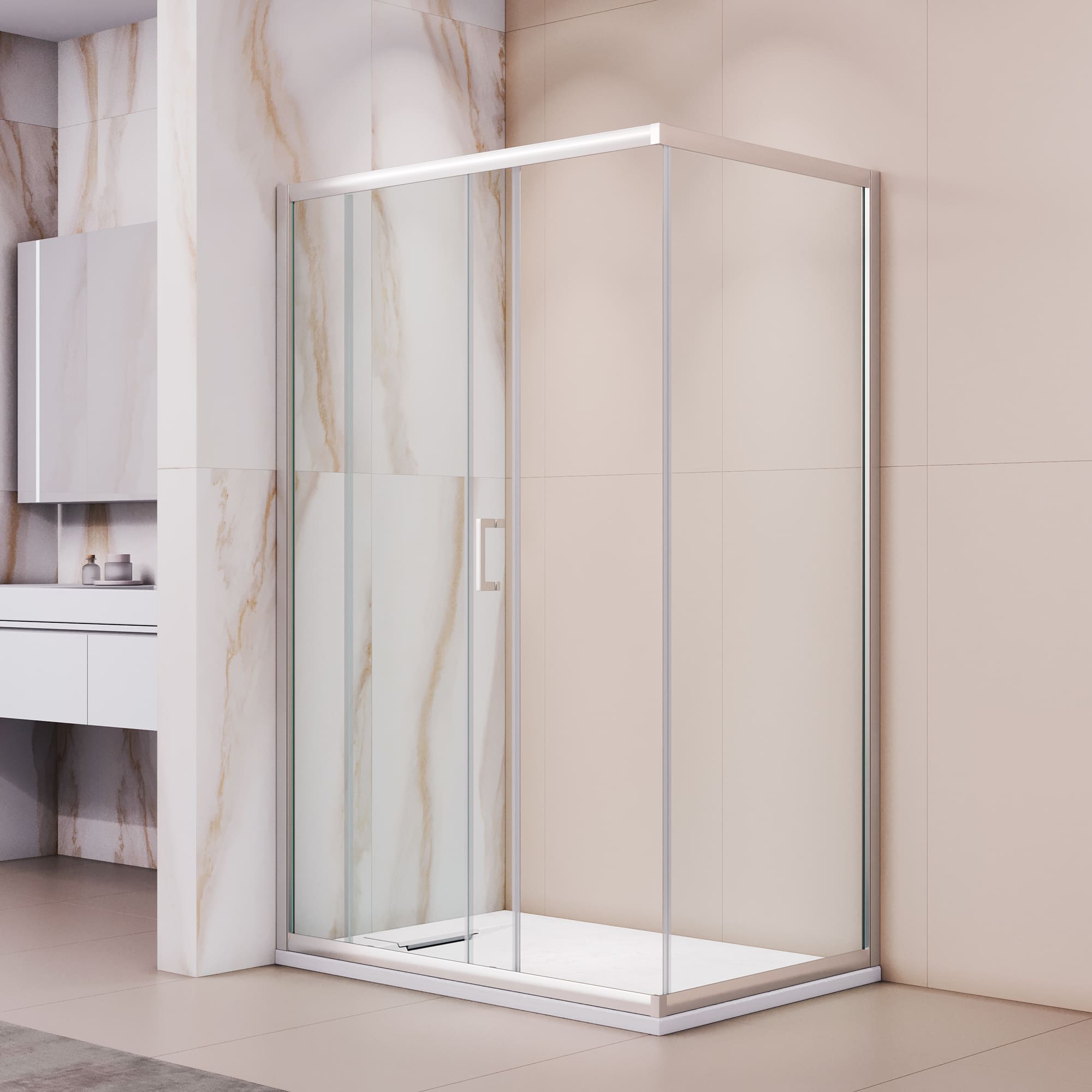 Высота душевого угла составляет 1900 мм, что позволит вам комфортно принимать душ, даже если вы высокого роста. Конструкция дверей раздвижная, что экономит место в ванной комнате. Этот душевой уголок также имеет регулируемый профиль, что позволяет легко настроить его на любые условия установки.