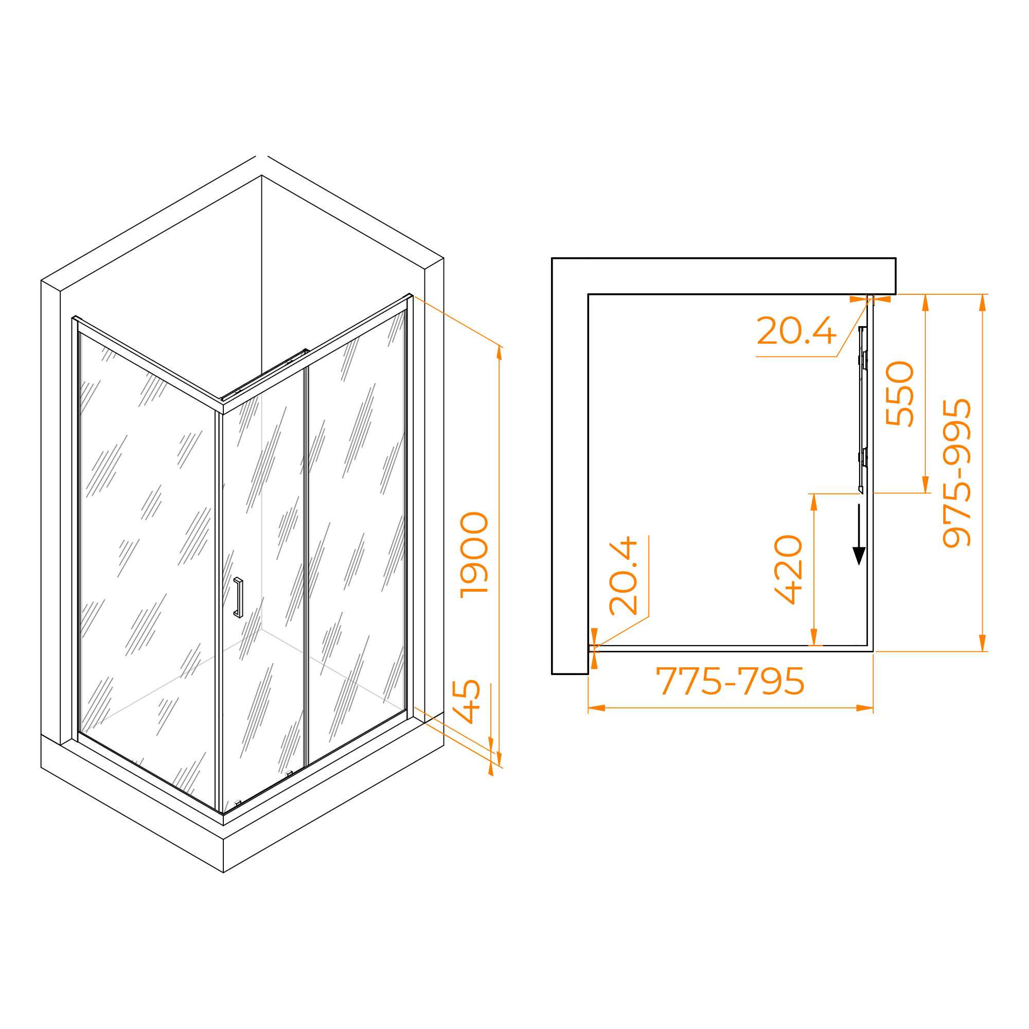 Двойные регулируемые ролики обеспечивают плавное и легкое открывание и закрывание дверей. Конструкция дверей раздвижная, что экономит место в ванной комнате и позволяет легко обслуживать душевой уголок.