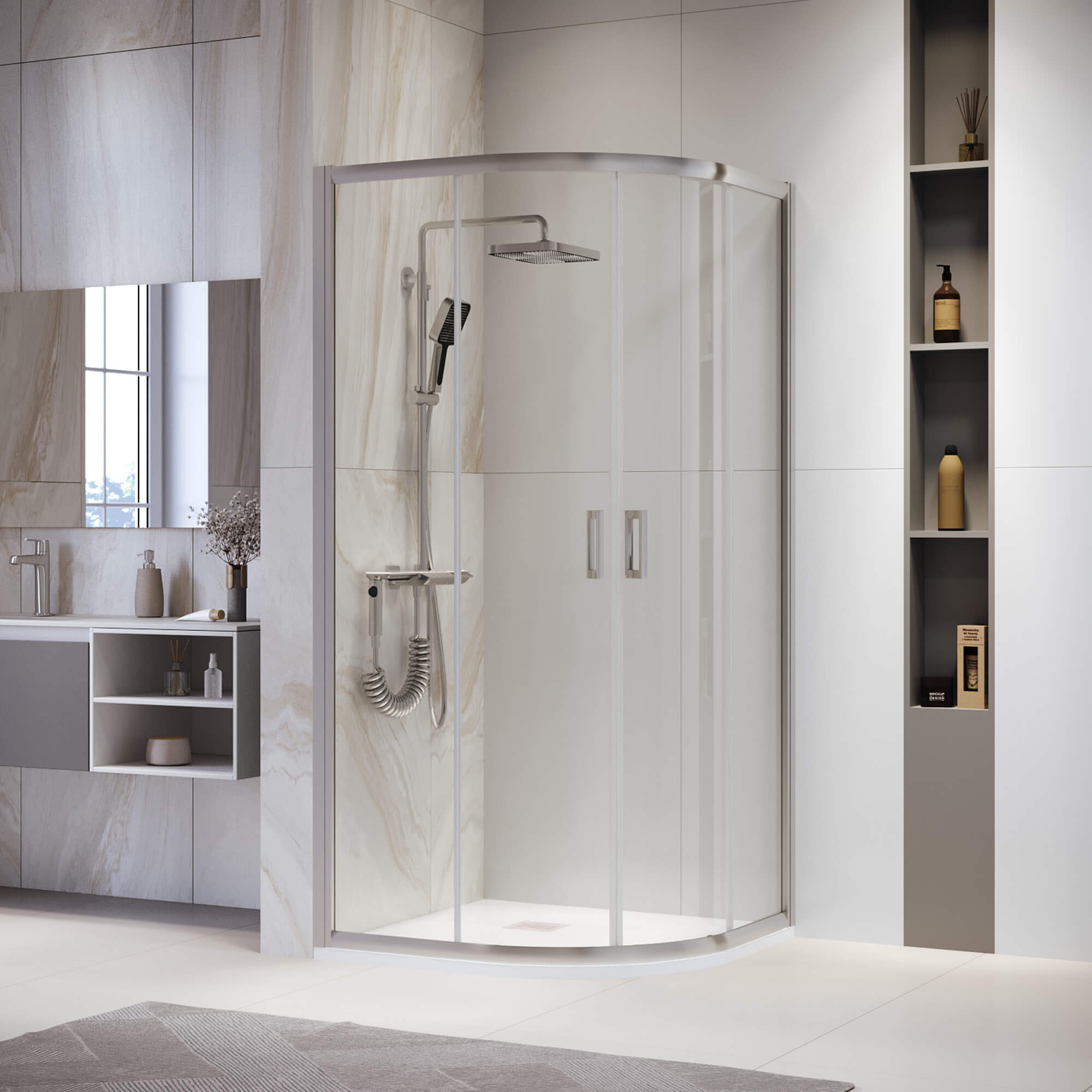 Форма данного душевого уголка полукруглая, что позволяет эффективно использовать пространство ванной комнаты и создает уютную и комфортную обстановку.