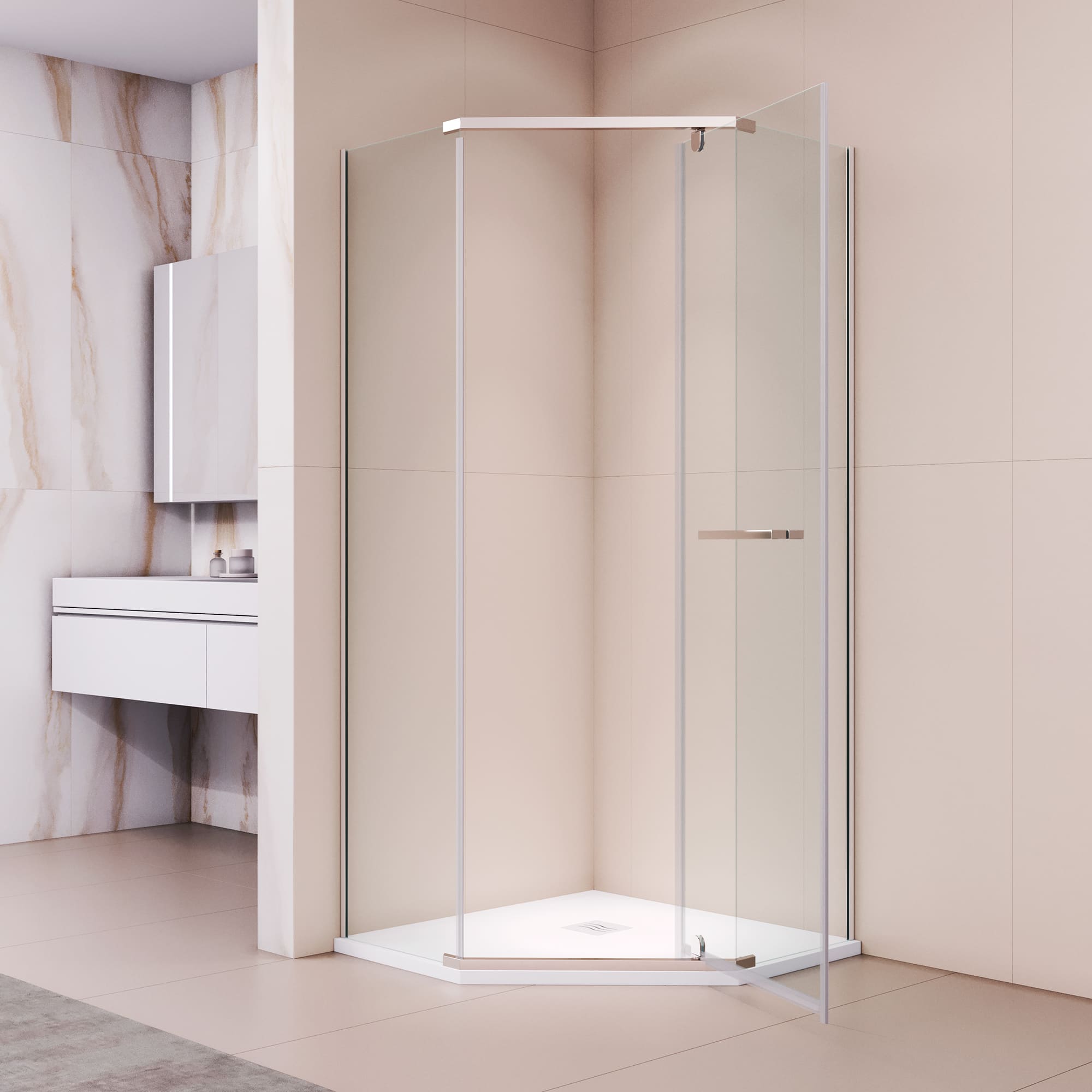 Форма душевого угла выполнена в виде трапеции, что позволяет установить его в различных типах помещений и отлично подходит для небольших ванных комнат. Эта форма обеспечивает удобство использования и максимальный комфорт для пользователей.