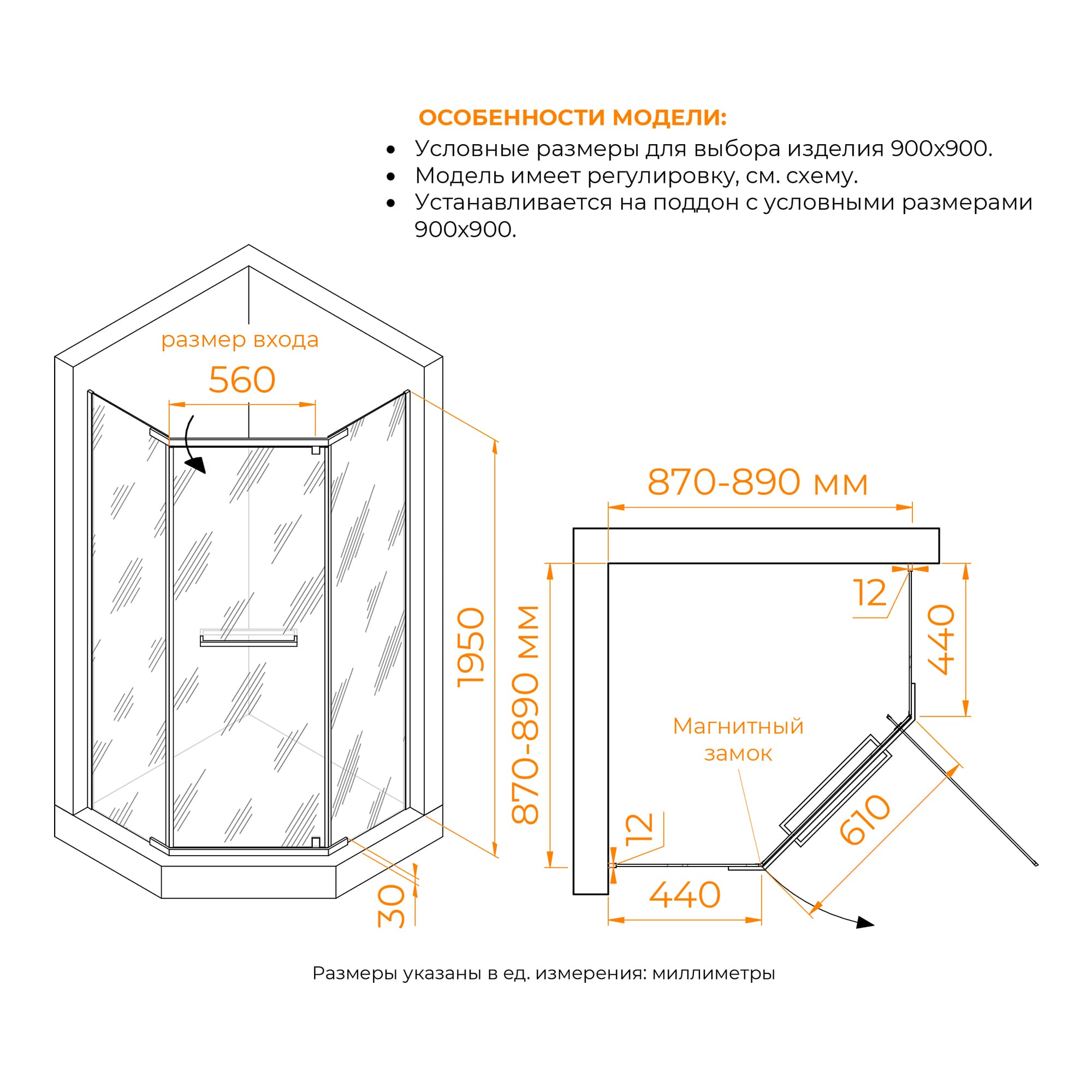 Душевой уголок RGW PA-82B - это надежная и долговечная конструкция. Закаленное стекло толщиной 6 мм и алюминиевый профиль обеспечивают максимальную прочность. Распашные двери с водонепроницаемыми петлями гарантируют герметичность и предотвращают протекание воды. Регулируемый профиль позволяет легко установить уголок в любой нише. Трапециевидная форма оптимизирует использование пространства ванной комнаты, а благодаря универсальному черному цвету профиля уголок впишется в любой интерьер.