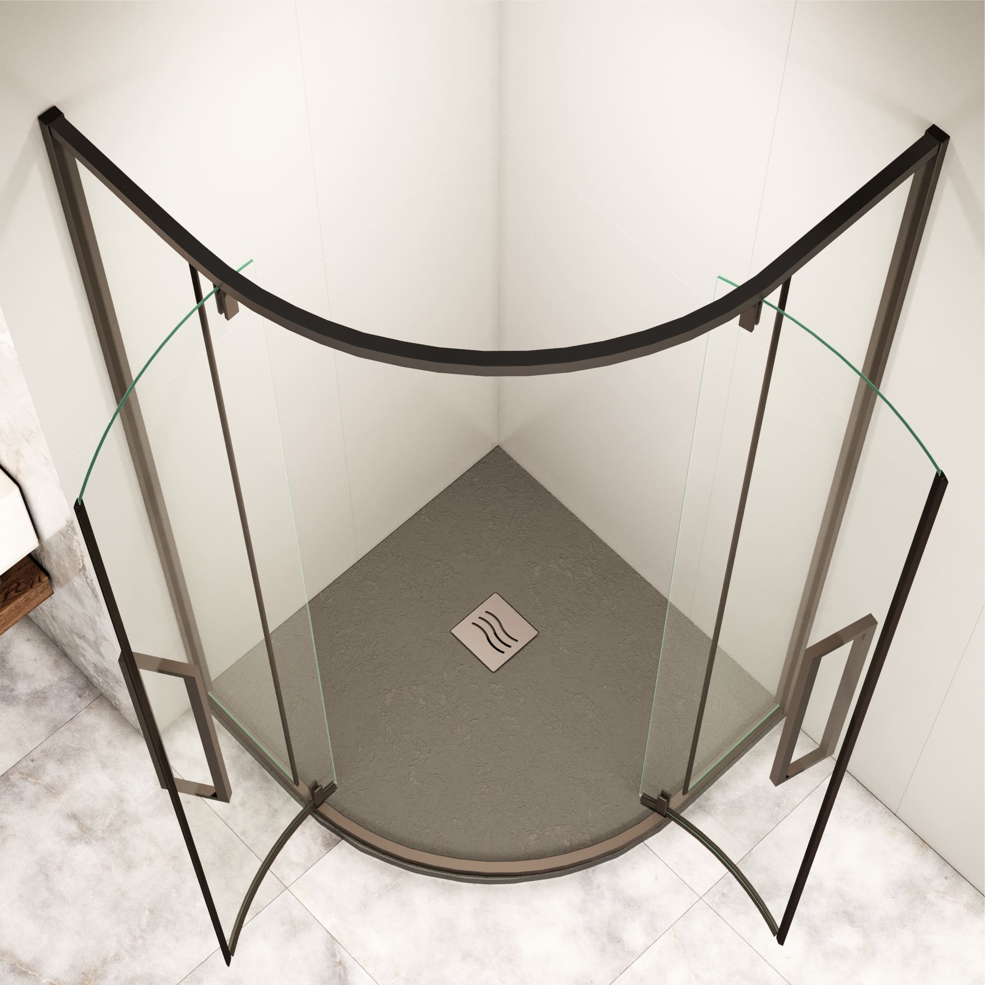 Полукруглый угол с радиусом под душевой поддон R-550 мм (евростандарт), образует душевую зону в четверть круга. Он состоит из четырех полотен стекла - два стационарных полотна и два полотна «Дверь», которые распахиваются, раскрывая широкий вход, благодаря элегантным маятниковым петлям. Роскошные, вертикальные, двухсторонние, стальные ручки тип «скоба», чрезвычайно удобны в открытии и закрытии дери.