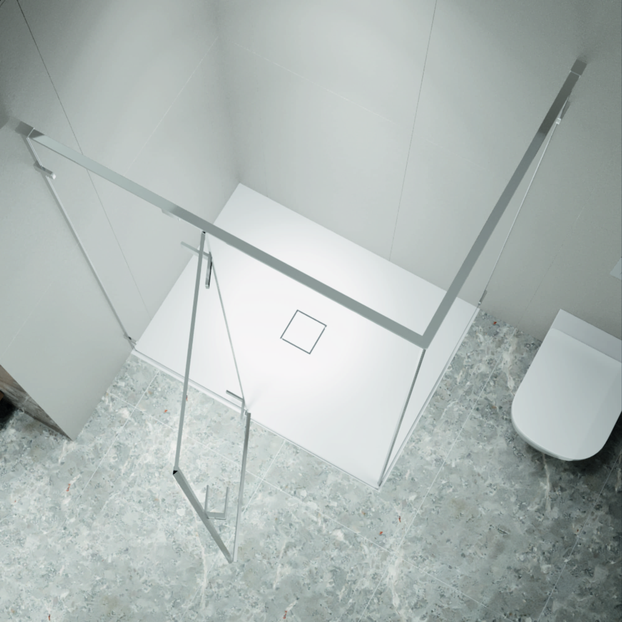 Душевой уголок состоит из трех полотен стекла - два стационарных полотна и одно полотно «Дверь», которая распахивается на широкий вход, благодаря двум элегантным прямоугольным петлям, типа «стекло-стекло».