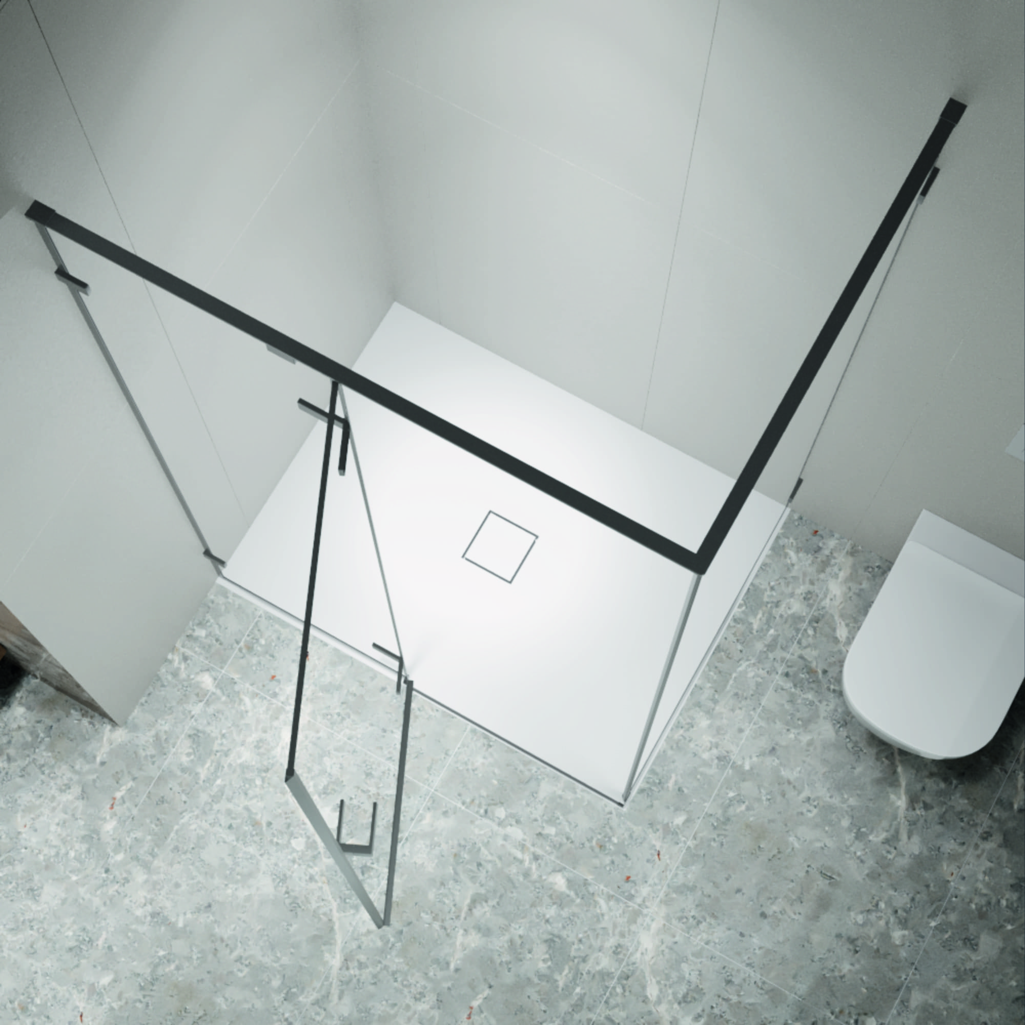 Душевой уголок состоит из трех полотен стекла - два стационарных полотна и одно полотно «Дверь», которая распахивается на широкий вход, благодаря двум элегантным прямоугольным петлям, типа «стекло-стекло».