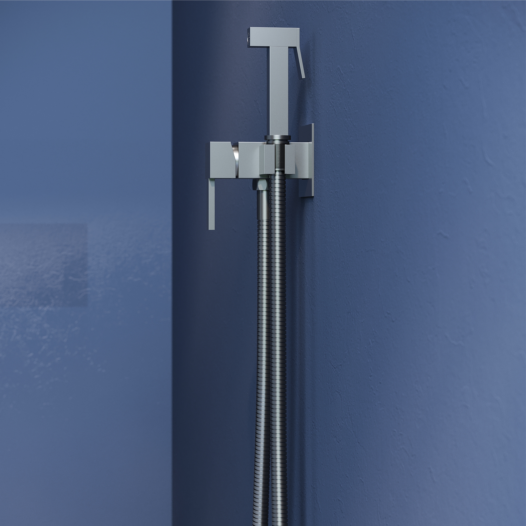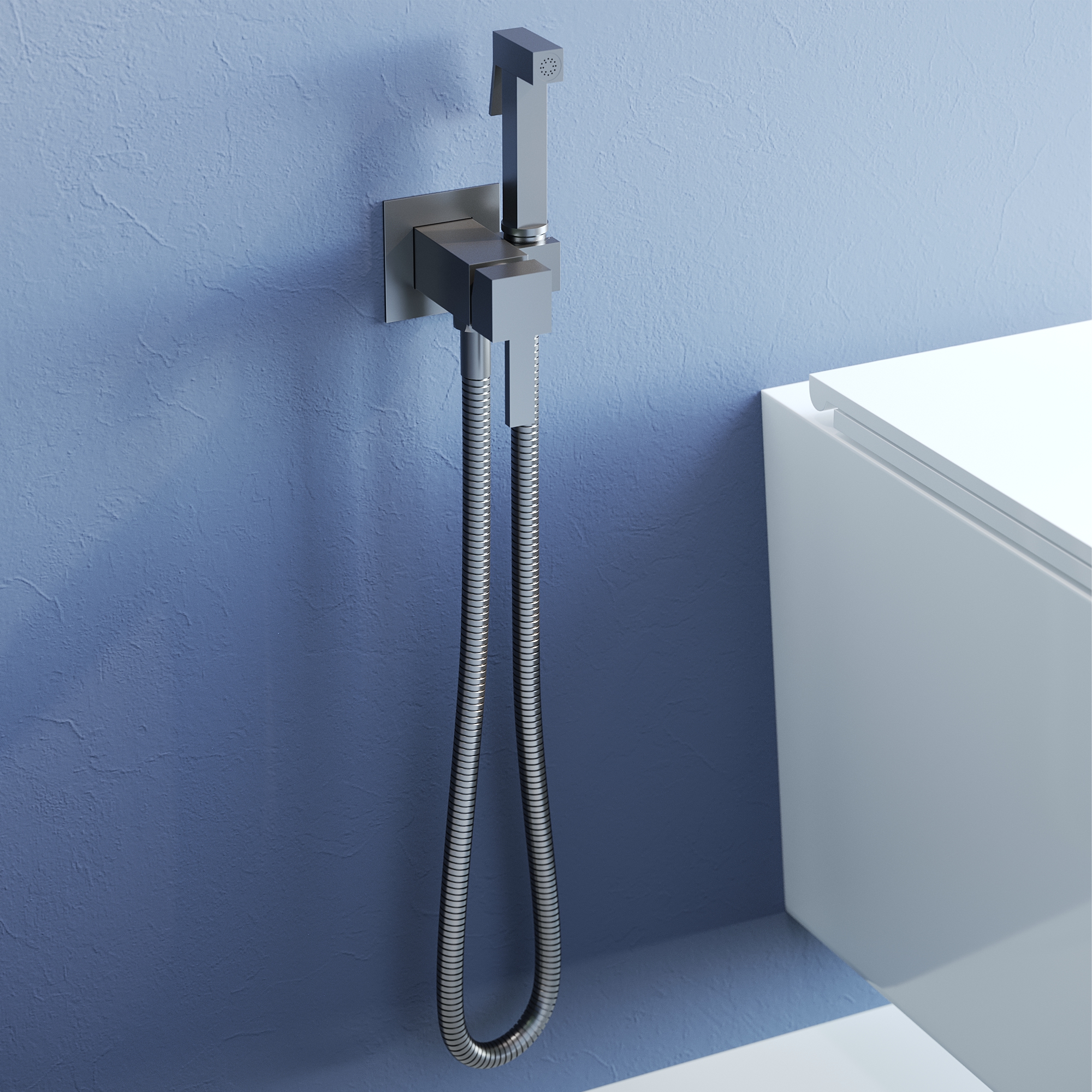 Смеситель квадратной формы с гигиенической лейкой, средняя струя. Струя из гигиенического душа выходит плотная, упругая и направленная. Она может быть как мягкой рассеянной, так и интенсивной, в зависимости от выбранного напора воды. Её температура легко регулируется от прохладной до комфортно тёплой. Вода подаётся равномерно без пульсаций, обеспечивая точное и аккуратное очищение. Форма струи в этой модели узконаправленная, что делает её удобной для гигиенических процедур.