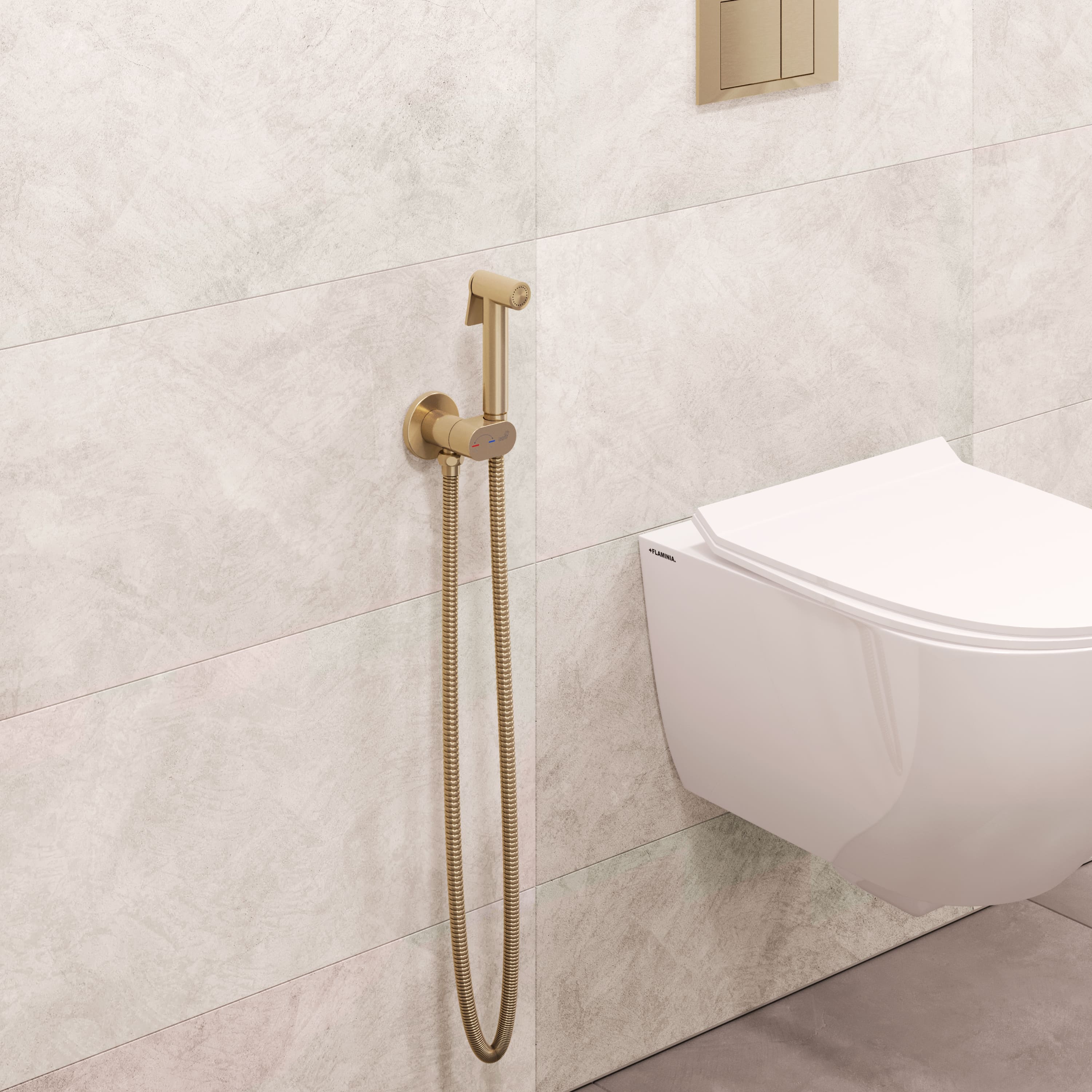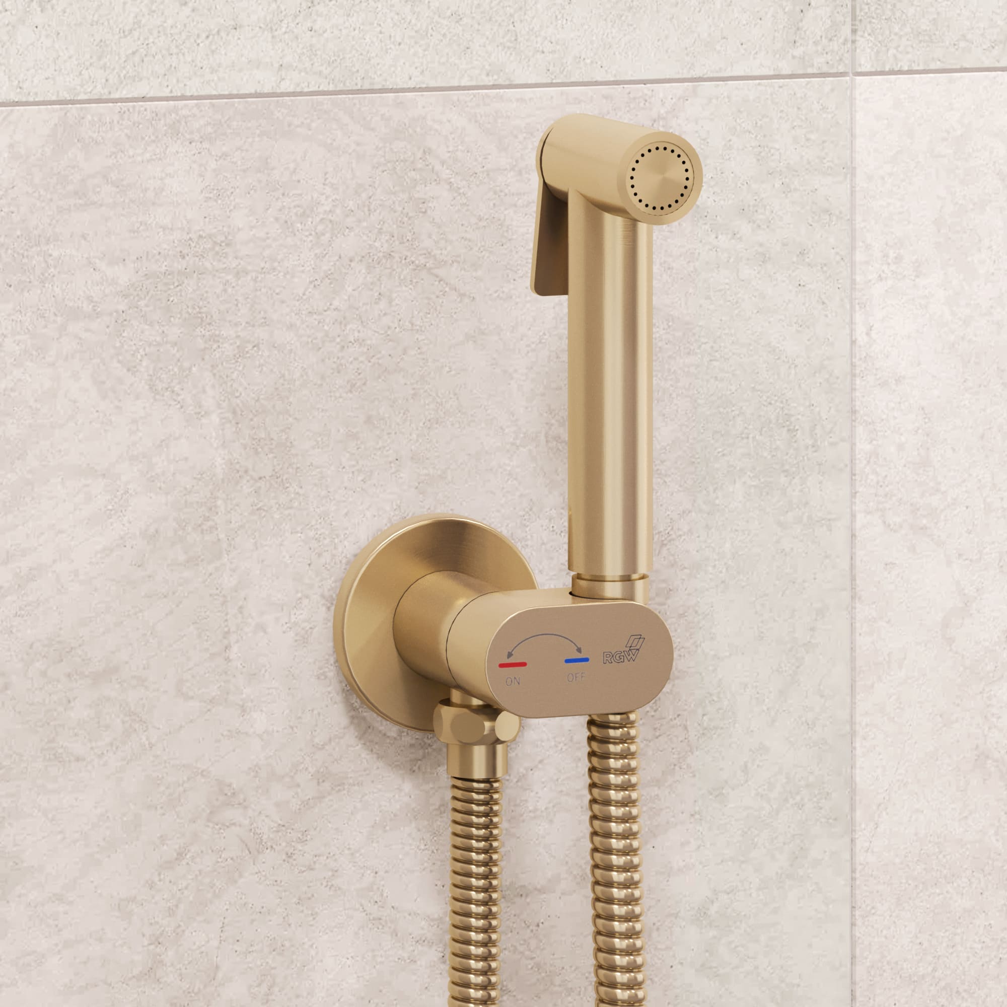 Самый миниатюрный комплект Гигиенического душа золотого цвета со смесителем и краном держателем лейки, скрытого монтажа RGW SP-213Gb, с прогрессивным поворотным картриджем, оснащён функцией «Умная блокировка». Гигиенический душ со смесителем круглой формы, инсталляционный, встройка в стену RGW SP-213Gb— это сантехническое оборудование, придуманное для соблюдения личной гигиены. Обычно его устанавливают возле унитаза, тем самым в небольших пространствах ванных комнат он заменяет биде. Первое, что приходит на ум, когда слышите «Гигиенический душ для унитаза (гигдуш — в бытовом разговоре)» — это моментальная гигиена интимной зоны сразу после туалета без использования туалетной бумаги.