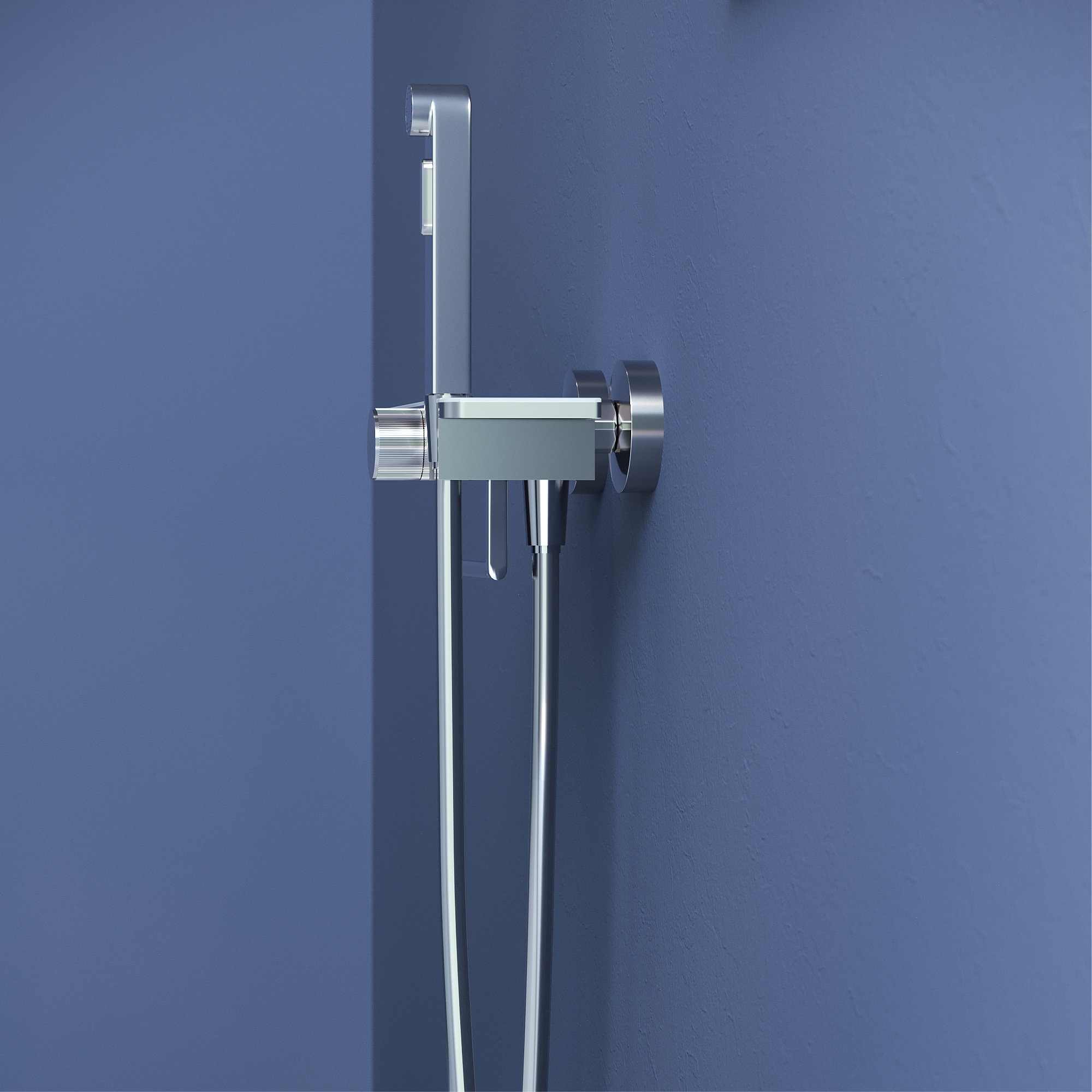Смеситель и гигиеническая лейка имеют универсальную геометрическую форму. Лейка душа — на два типа крепления: вертикальное и встроенное. Поток воды регулируется нажатием кнопки, она расположена на ручке лейки.