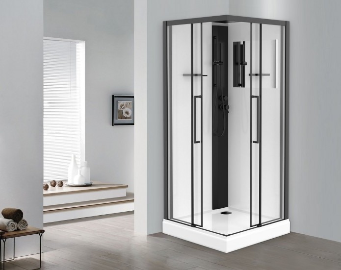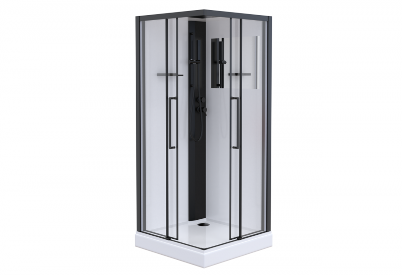 Низкий (125мм) поддон с бортиками по периметру. Съёмный экран высотой 75мм. Сифон с гидрозатвором. Лицевые прозрачные стекла (5 мм) с покрытием Easy Clean. Задние стенки - "супербелое" крашенное стекло (5мм), покрытое защитной плёнкой. Замковое соединение профилей. Профиль алюминиевый (черный матовый). Функциональная панель из ПВХ. Душевая лейка с регулируемым держателем. Двойные (спаренные) верхние ролики, внизу блок скольжения. Крыша - "супербелое" крашенное стекло (6мм), покрытое защитной плёнкой. Верхний душ из нержавеющей стали.