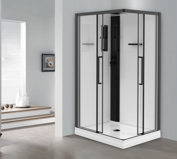 Низкий (125мм) поддон с бортиками по периметру. Съёмный экран высотой 75мм. Сифон с гидрозатвором. Лицевые прозрачные стекла (5 мм) с покрытием Easy Clean. Задние стенки - "супербелое" крашенное стекло (5мм), покрытое защитной плёнкой. Замковое соединение профилей. Профиль алюминиевый (черный матовый). Функциональная панель из ПВХ. Душевая лейка с регулируемым держателем. Двойные (спаренные) верхние ролики, внизу блок скольжения. Крыша - "супербелое" крашенное стекло (6мм), покрытое защитной плёнкой. Верхний душ из нержавеющей стали.
