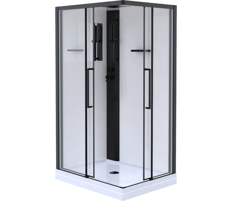 Низкий (125мм) поддон с бортиками по периметру. Съёмный экран высотой 75мм. Сифон с гидрозатвором. Лицевые прозрачные стекла (5 мм) с покрытием Easy Clean. Задние стенки - "супербелое" крашенное стекло (5мм), покрытое защитной плёнкой. Замковое соединение профилей. Профиль алюминиевый (черный матовый). Функциональная панель из ПВХ. Душевая лейка с регулируемым держателем. Двойные (спаренные) верхние ролики, внизу блок скольжения. Крыша - "супербелое" крашенное стекло (6мм), покрытое защитной плёнкой. Верхний душ из нержавеющей стали.