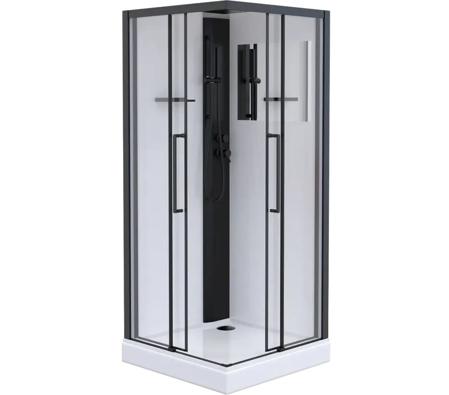 Низкий (125мм) поддон с бортиками по периметру. Съёмный экран высотой 75мм. Сифон с гидрозатвором. Лицевые прозрачные стекла (5 мм) с покрытием Easy Clean. Задние стенки - "супербелое" крашенное стекло (5мм), покрытое защитной плёнкой. Замковое соединение профилей. Профиль алюминиевый (черный матовый). Функциональная панель из ПВХ. Душевая лейка с регулируемым держателем. Двойные (спаренные) верхние ролики, внизу блок скольжения. Крыша - "супербелое" крашенное стекло (6мм), покрытое защитной плёнкой. Верхний душ из нержавеющей стали.