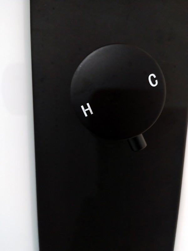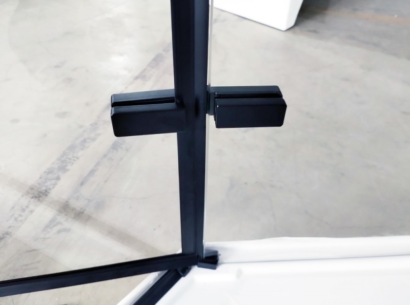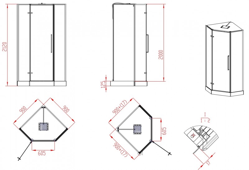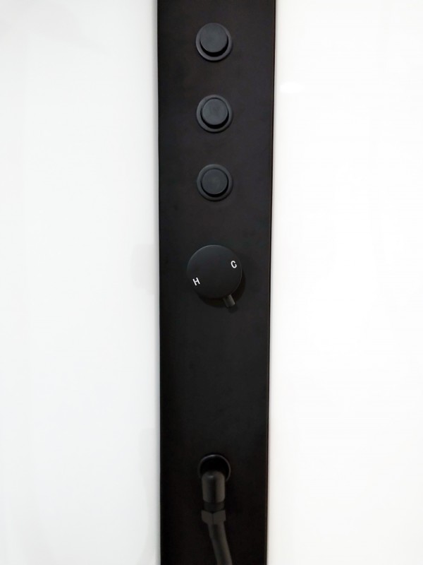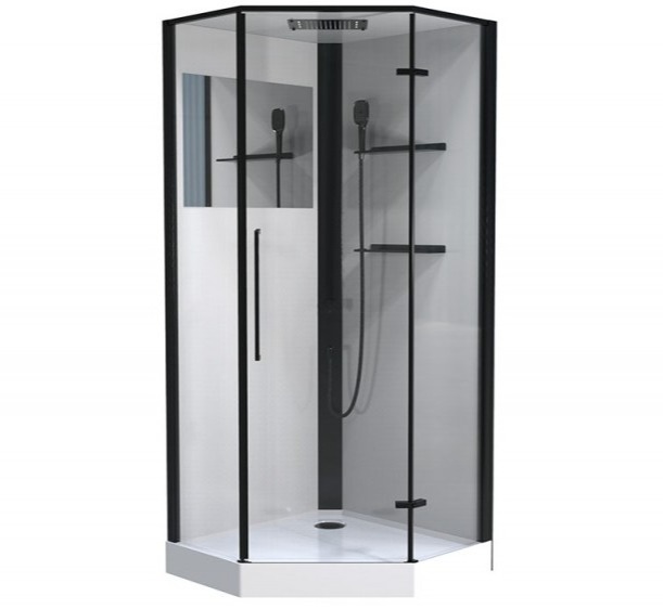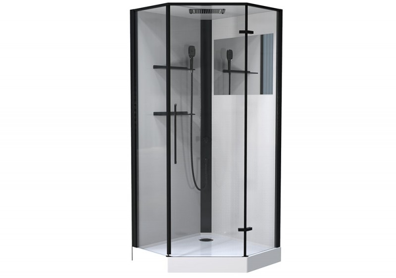 Низкий (125мм) поддон с бортиками по периметру. Сифон 90мм с гидрозатвором . Лицевые прозрачные стекла (6 мм) с покрытием Easy Clean. Задние стенки - "супербелое" крашенное стекло (5мм), покрытое защитной плёнкой. Замковое соединение профилей. Профиль алюминиевый (черный матовый). Функциональная панель из ПВХ с 3-позиционным переключателем (кнопочное управление), ручной лейкой из ПВХ, массажными форсунками, полкой и шлангом из ПВХ (длина 1,5 м); Смеситель без регулировки напора воды; «Интегрированное» зеркало (62x50 см) на задней стенке кабины. Душевая лейка. Дверные петли из латуни. Крыша - "супербелое" крашенное стекло (6мм), покрытое защитной плёнкой. Верхний душ из нержавеющей стали.