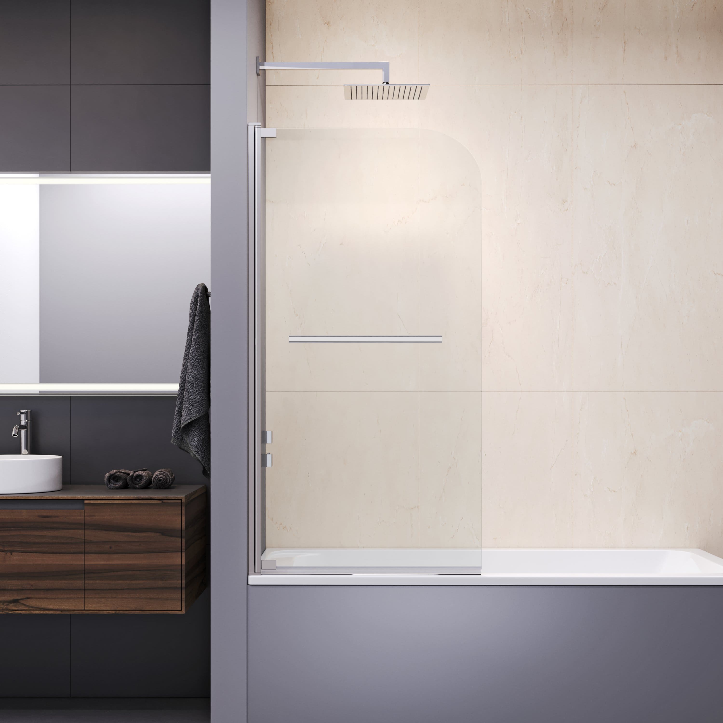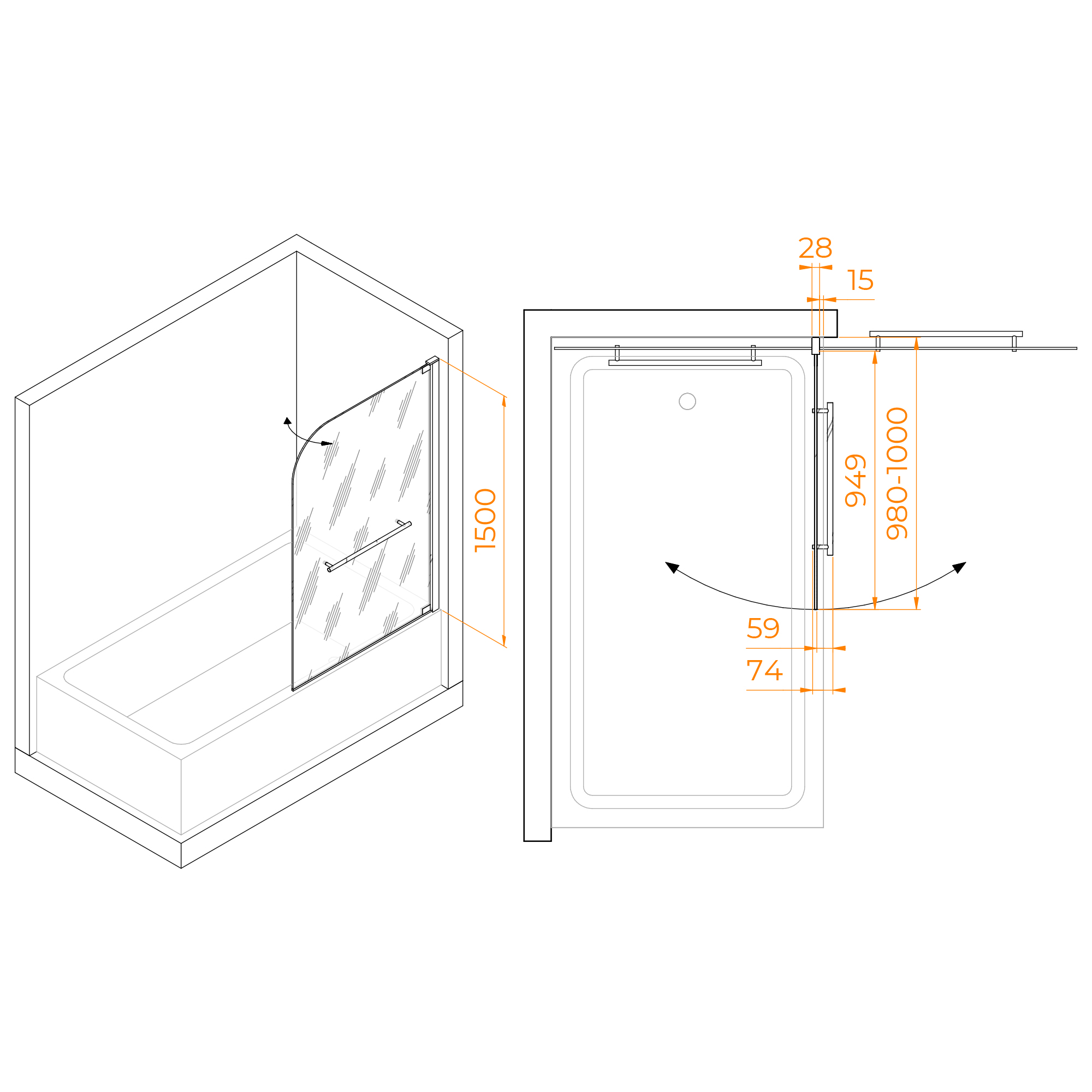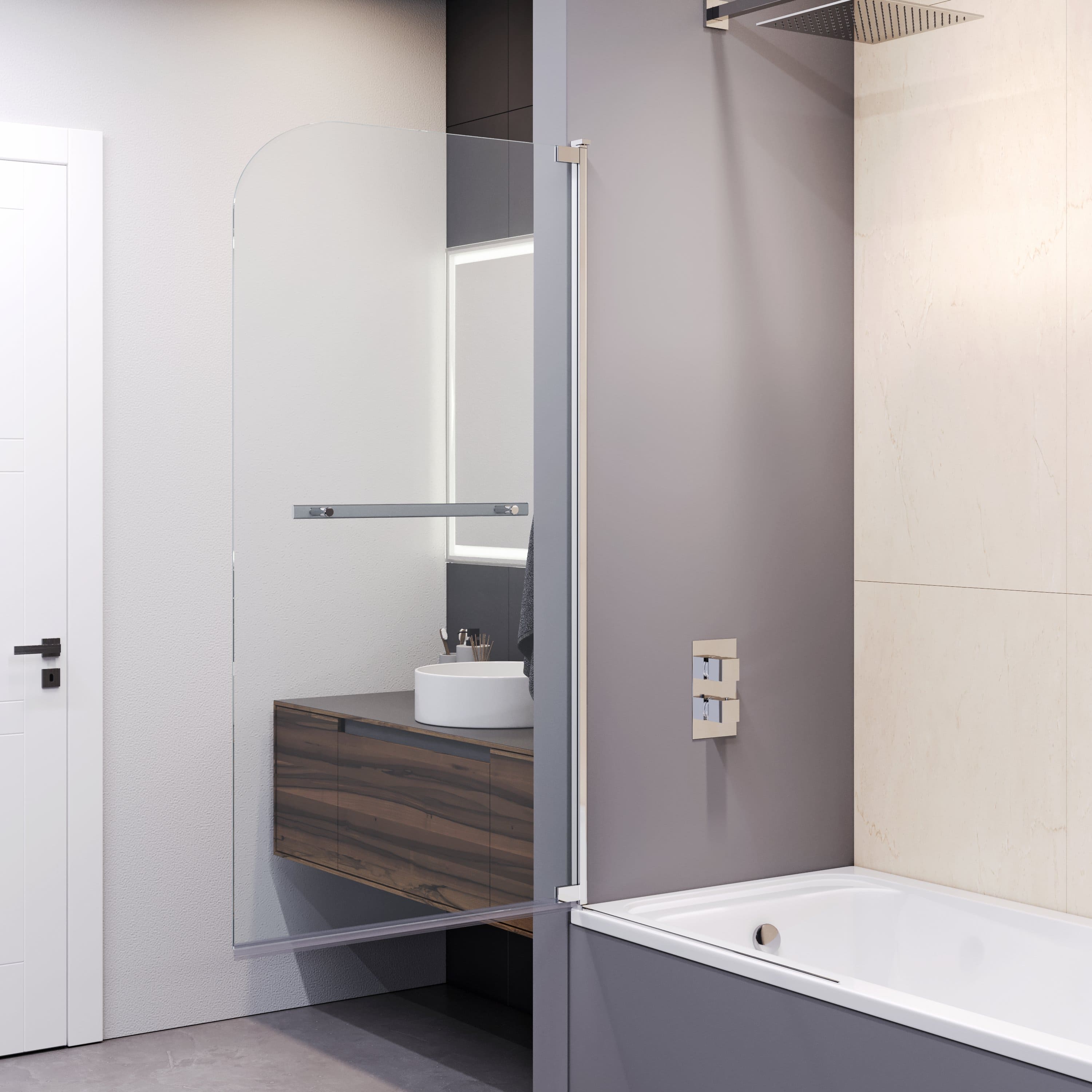 Высота стеклянной шторки составляет 1500 мм и она имеет маятниковую конструкцию, позволяющую легко и удобно открывать и закрывать ее. При этом, отличительной особенностью данной модели является наличие покрытия Easy Clean, которое позволяет легко удалять загрязнения и оставлять поверхность стекла в чистоте и блеске.