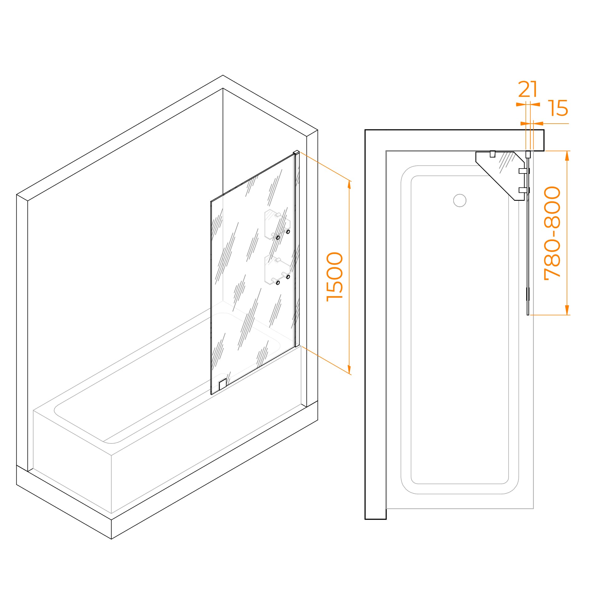 Высота стеклянной шторки равна 1500 мм. Такая высота идеально подходит большинству типов ванн и обеспечивает высокую степень защиты от брызг и протечек воды.